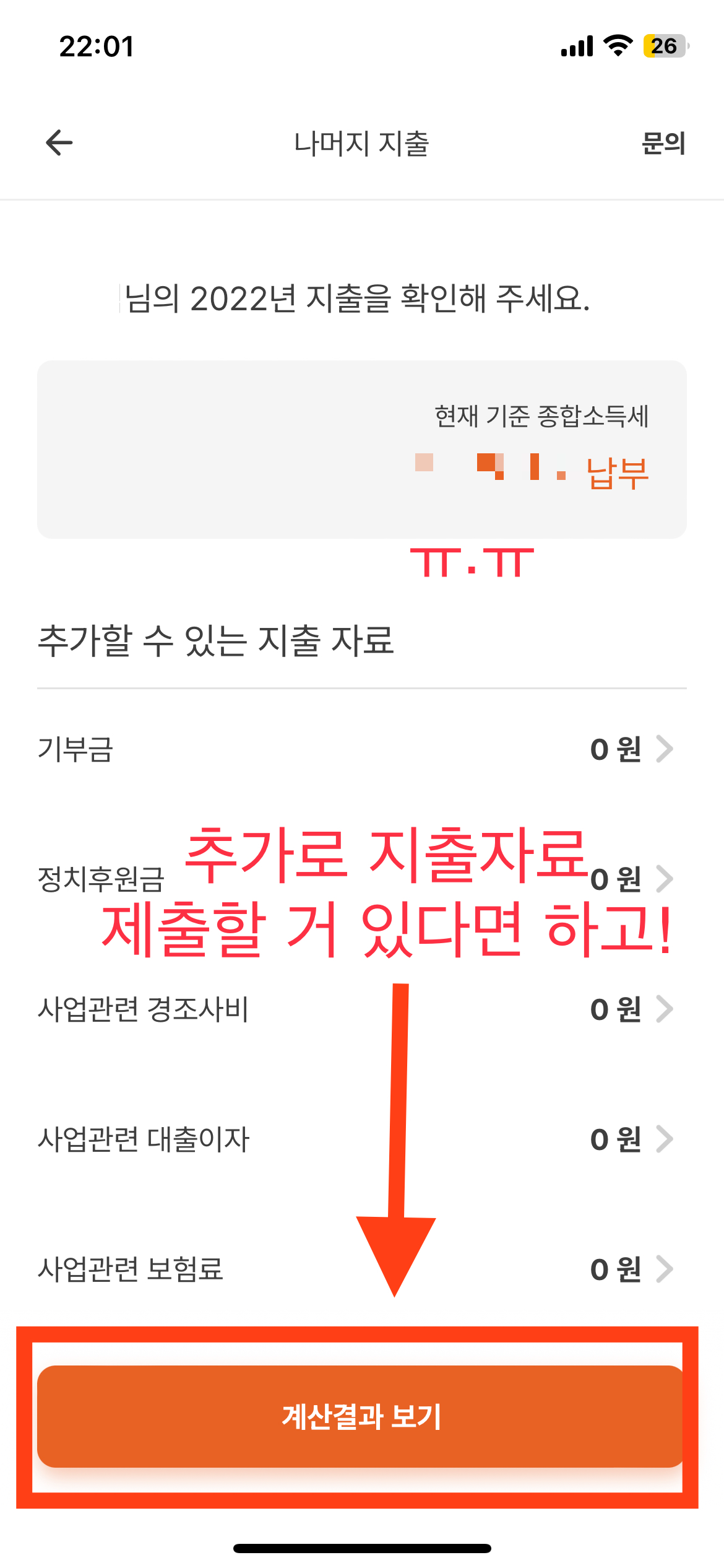 현재 기준 종합소득세가 나오고, 내가 추가로 제출가능한 지출자료가 있는 경우는 아래 항목 중에서 선택해서 제출 후 하단에 보이는 [계산결과 보기] 버튼을 터치해 주자.