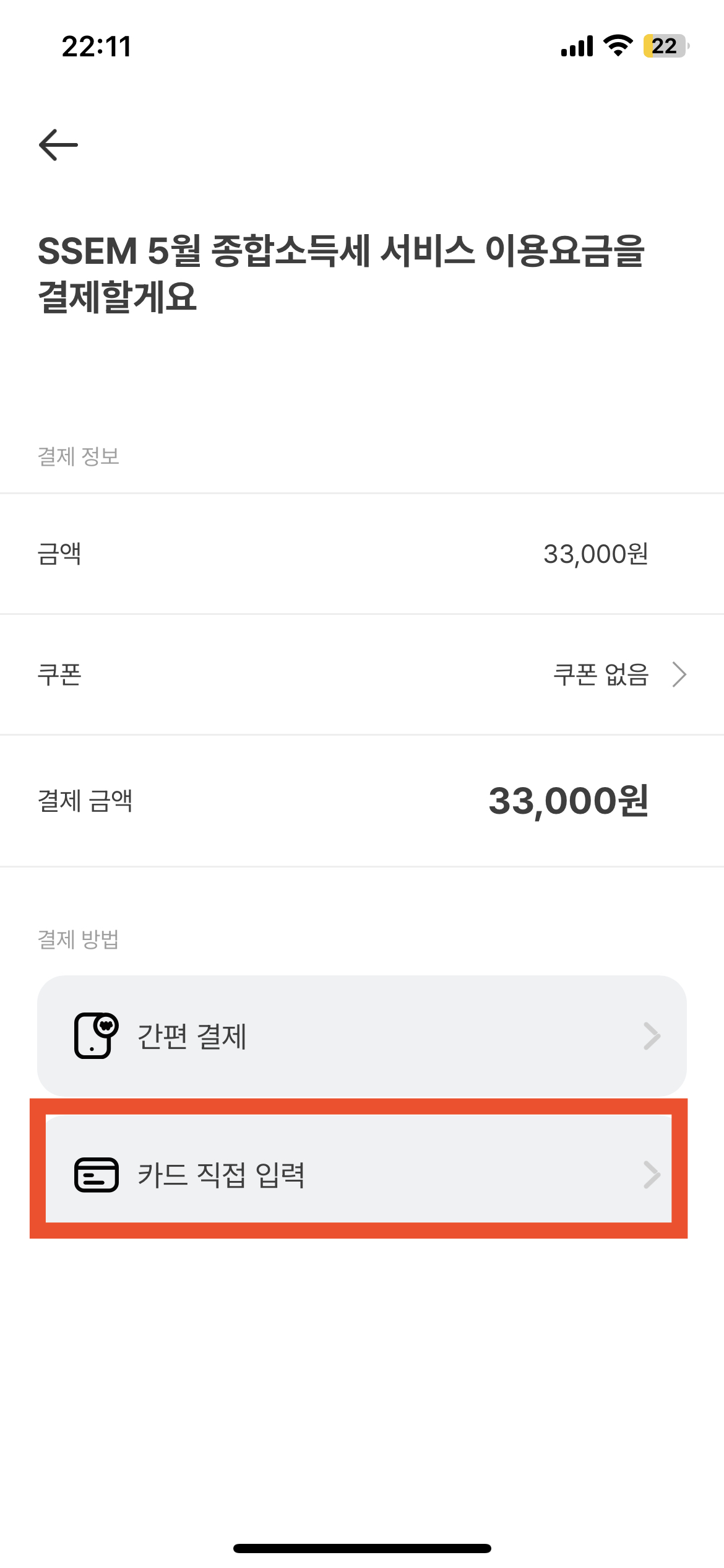 결제 방법은 두 가지가 있는데 본인이 편한 방법으로 하면 되고, 내 경우는 카드번호를 직접 입력해서 결제하는 방법을 선택했다.