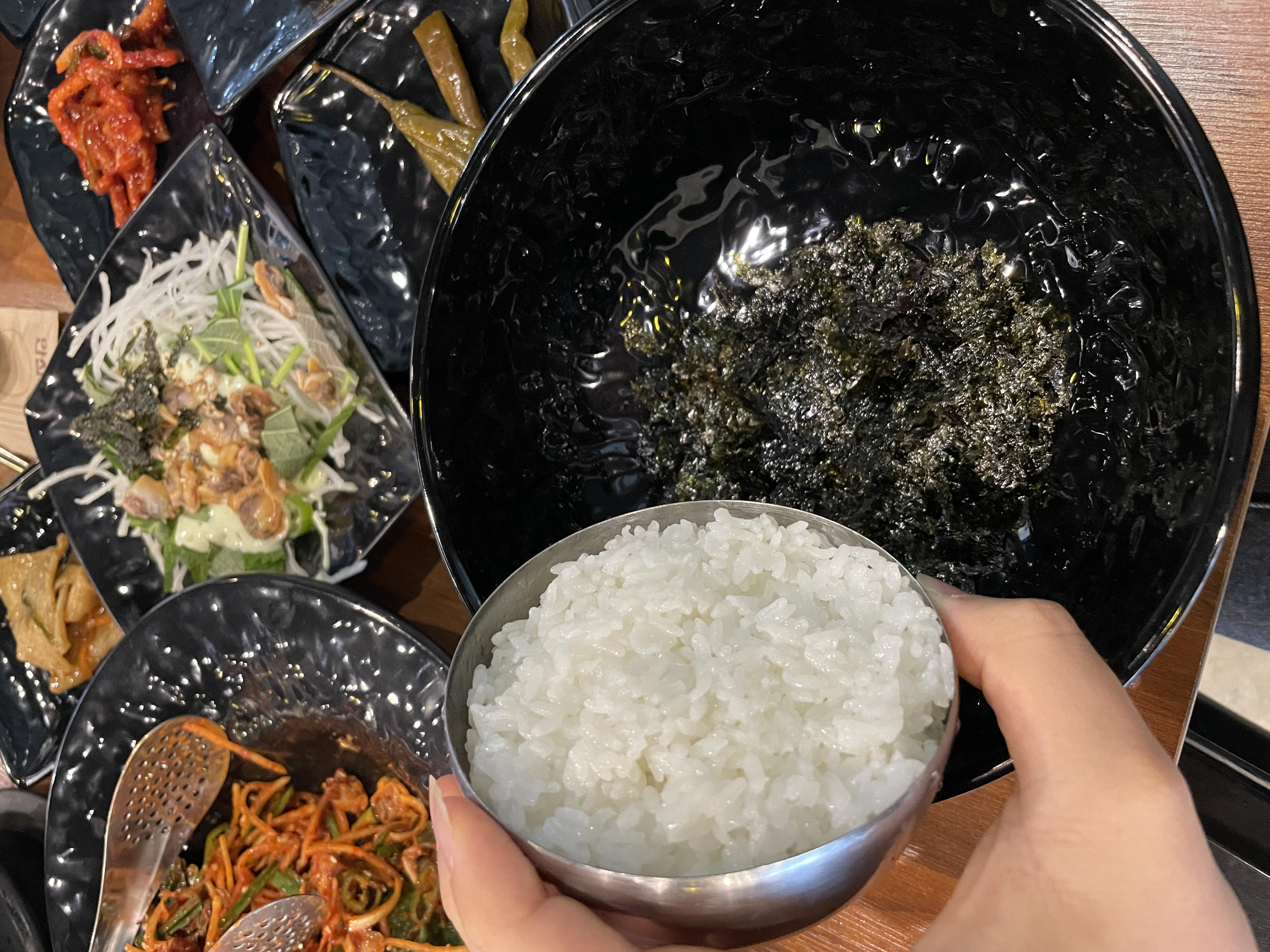 위 사진처럼 큰 그릇에 김가루와 참기름을 넣어서 주시는데, 밥과 꼬막무침을 적절하게 넣어서 비벼먹으면 된다. 일반 성인이라면 밥을 모두 넣고 꼬막무침을 조절해서 넣으면 될 것으로 보인다.