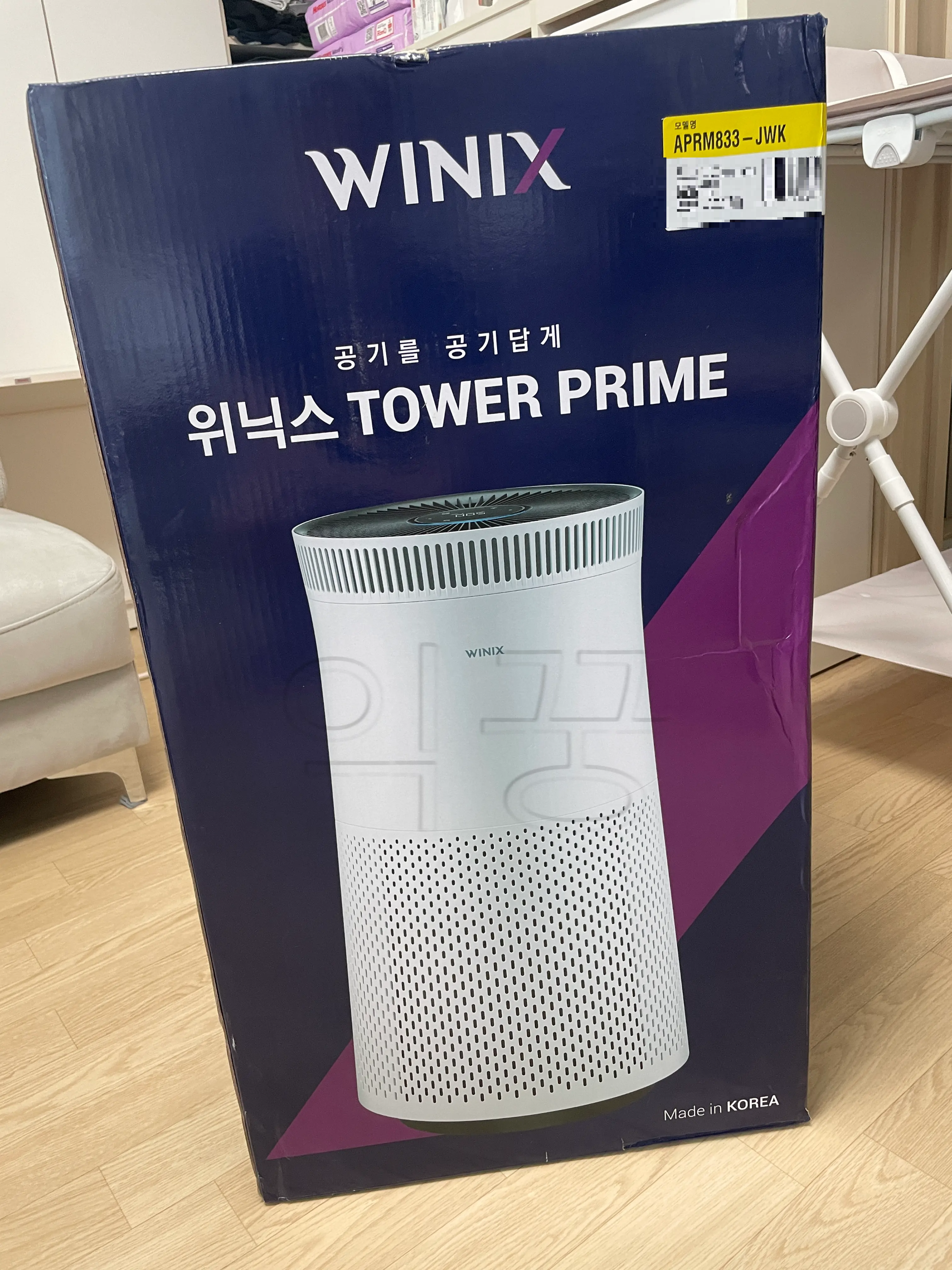 3일 정도를 기다렸다가 택배를 받았으며, 내 생각보다 훨씬 더 큰 공기청정기가 도착했다. 외부 박스에는 타워프라임의 외형 사진과 함께 모델명인 APRM833-JWK가 적혀있었다.