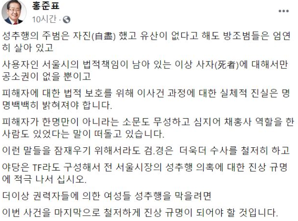 홍준표 서울시장은 자신의 페이스북에 글을 남겼는데, 주요 내용을 살펴보면 성추행의 주범은 없지만 그것을 방조한 방조범들이 엄연히 살아있으며, 공소권이 없을 뿐 피해자에 대한 법적 보호를 위해서 진실을 밝혀야 한다고 적었다.