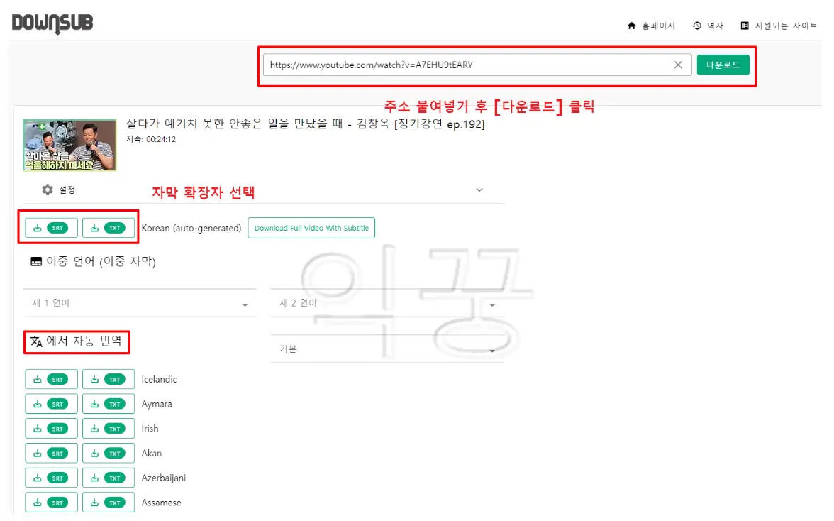 DownSub을 이용하면 유튜브 자막뿐만 아니라 Viki, Vlive 등 다양한 영상매체에서 스크립트를 추출해서 다운로드할 수 있는 사이트다. 또한 자막의 형태도 txt 뿐만 아니라 srt 확장자 형태를 지원하기 때문에 더욱 활용도가 넓다고 할 수 있다. 사용방법은 자막을 다운로드하려는 유튜브 영상 URL주소를 복사한 뒤 붙여 넣어주고, 다운로드하려는 자막 형식과 더불어 다양한 언어로 변환 후 추출을 시작하면 되고, 다른 방법으로는 유튜브 주소 앞에 subtitle.to/를 입력해서 추출하는 간단한 방법도 있다는 것은 DownSub만의 장점이다.