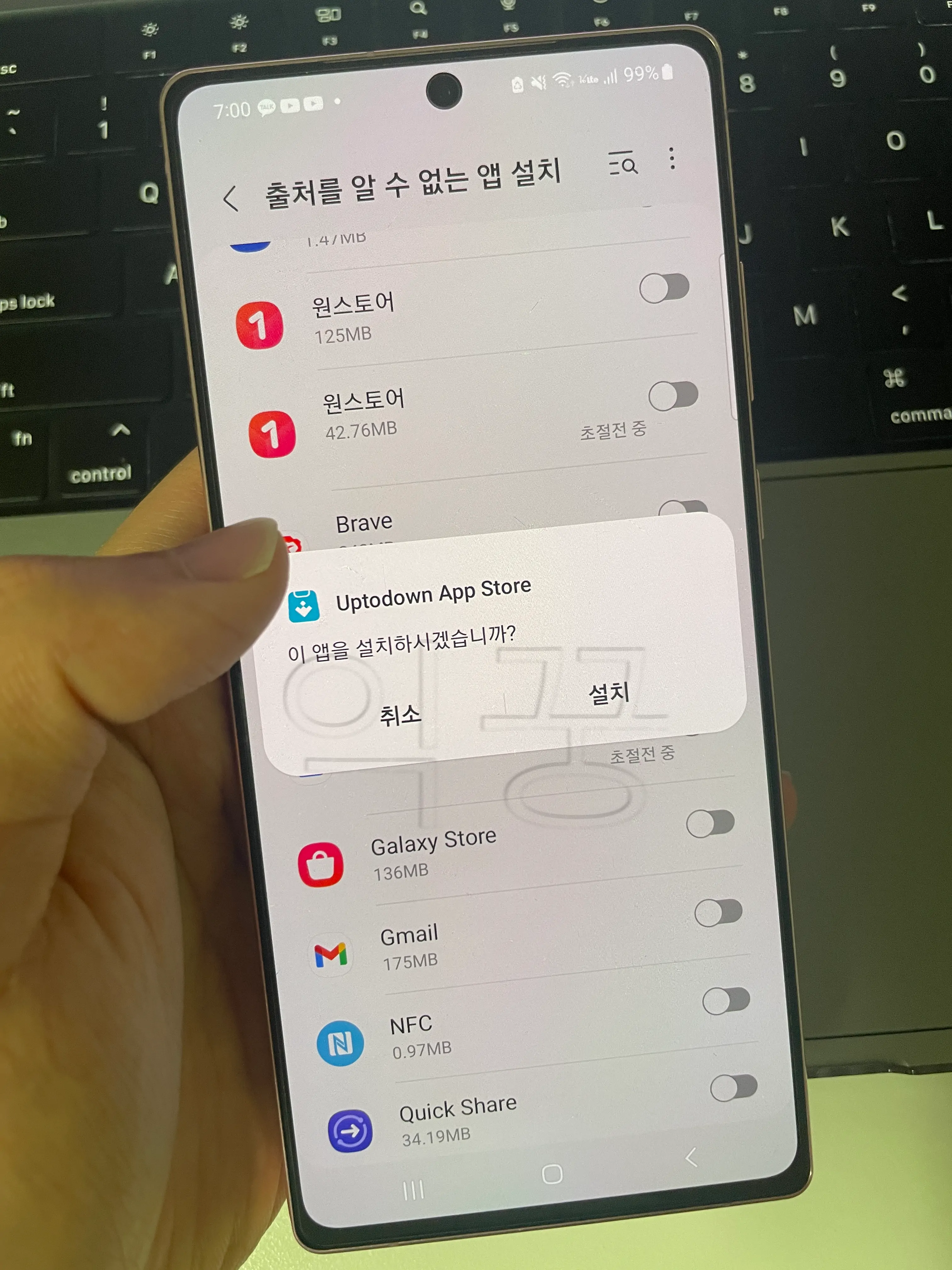 위에서 uptodown 앱을 다운로드한 뒤에 설치를 해야 한다. 위 사이트에 접속한 뒤에 다운로드 버튼을 누르면 '유해한 파일일 수도 있음'이라는 메시지가 나오는데 아래 선택지 중에서 [무시하고 다운로드]를 선택하고 다운로드를 완료한다. 그 이후에 출처를 알 수 없는 앱이기 때문에 자체적으로 설치를 막아뒀는데, 설정에서 출처를 알 수 없는 앱도 설치가 가능하도록 해제를 한 뒤에 [무시하고 설치] 버튼을 다시 한번 눌러주면 설치가 완료된다.