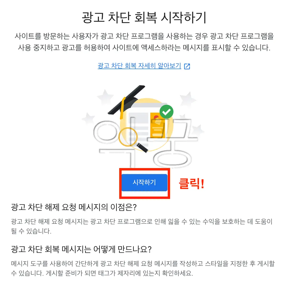 광고차단 회복을 시작한다는 것은 애드블록의 사용을 중지하고 내 사이트 접속 시 광고를 허용한 뒤 액세스 하라는 메시지를 노출시키는 것이 주요 골자다. 단, 이런 메시지가 나오도록 하기 위해서는 몇 가지 설정을 건드려야 하니 [시작하기] 버튼을 눌러 설정을 해보도록 하자.