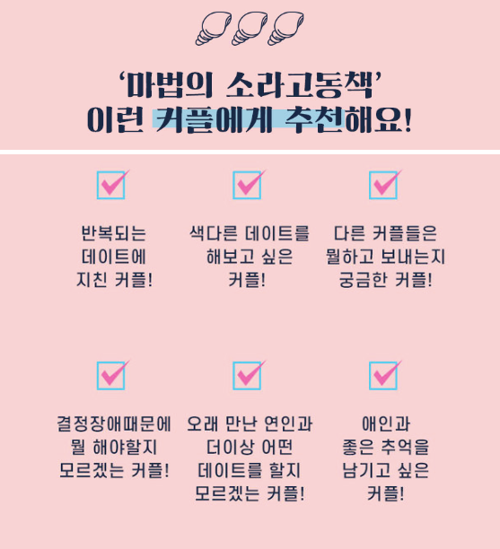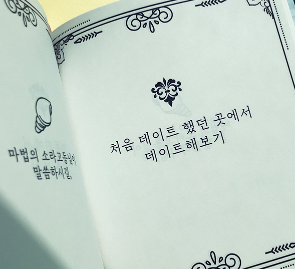 커플을 비롯해 동성친구, 썸남&썸녀, 친척들과도 함께 즐길 수 있는 버킷리스트를 잔뜩 모아놓은 가이드북이 바로 마법의 소라고동책이다.