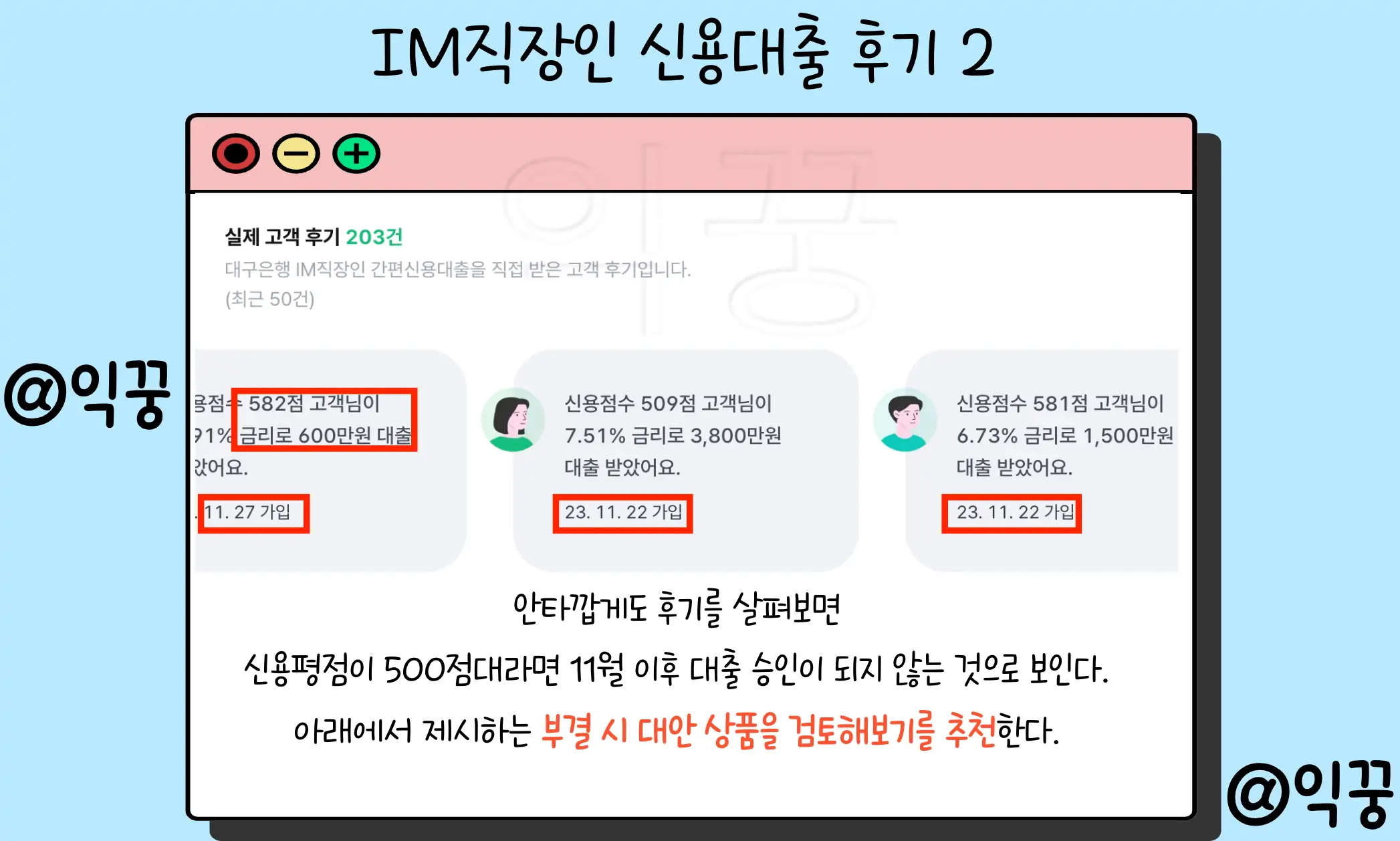 이번 글에서는 낮은 신용점수에도 비교적 높은 한도를 제공하는 대구은행 IM직장인 신용대출 상품 및 후기에 대해 알아보고 부결 시 대안상품은 뭐가 있는지 자세히 알아보았다. 도움이 되었기를 바라며 글을 마치도록 하겠다.