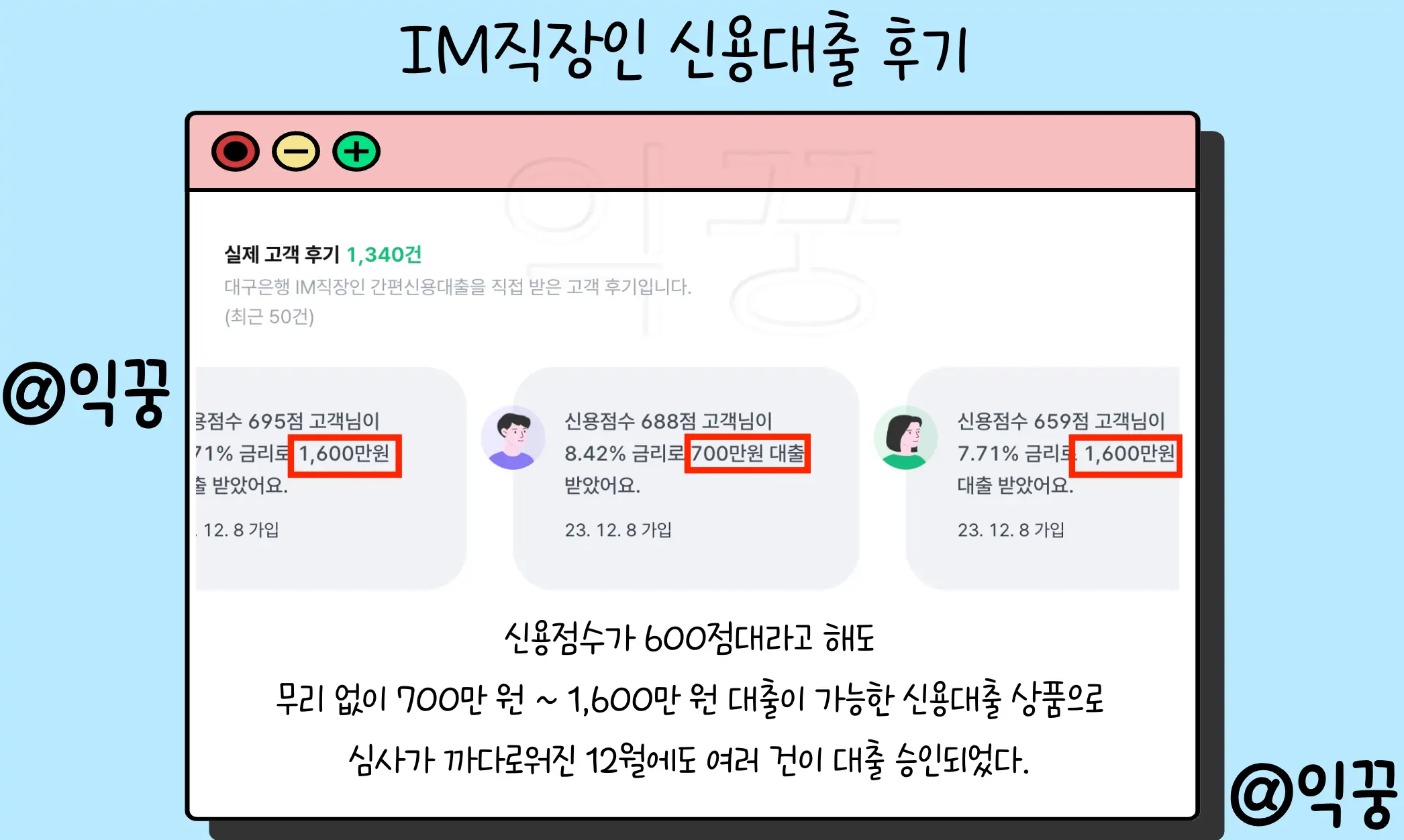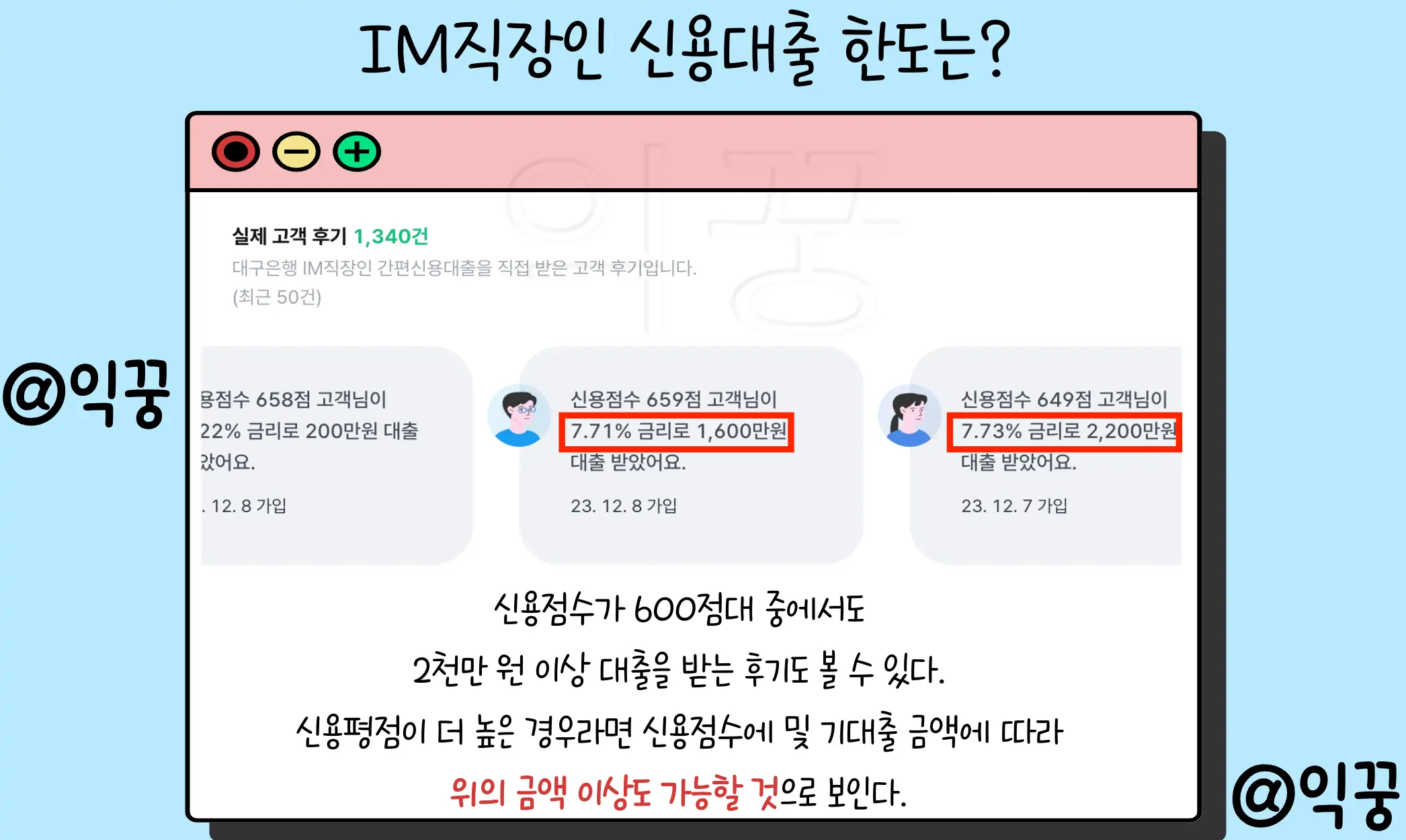 하지만 이 상품을 이용한 고객들의 실제 후기를 살펴보면 신용점수 600점 대 중반이나 후반이어도 1,500만 원 이상을 대출한 후기를 쉽게 찾아볼 수 있다.