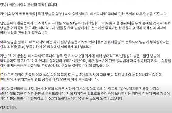 2. 방송심의규정을 들먹이며 사과문을 올렸으나, 방송심의에 걸릴 노래를 미리 확인한 후에 이러이러한 가사였다면 걸러내고 다른 곡을 연습시키는 것이 제작진이 할 역할이라고 생각했기 때문에 많은 이들이 사과문을 본 이후에 더 화가 난 것이다.