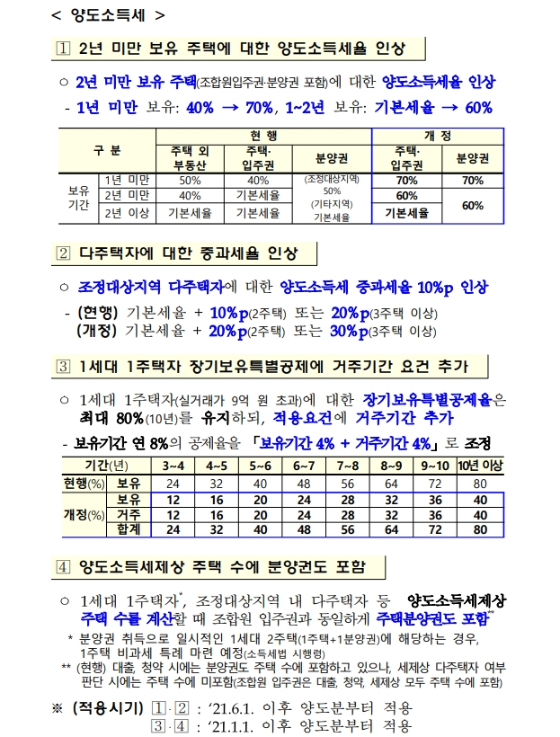 <1세대 1주택(실거래가 9억초과)장특공 거주요건 추가>와 <양도소득세상 분양권의 주택수 추가(다주택간주하여 야도세 중과)>는 2021년 1월 1일부터 적용된다.
