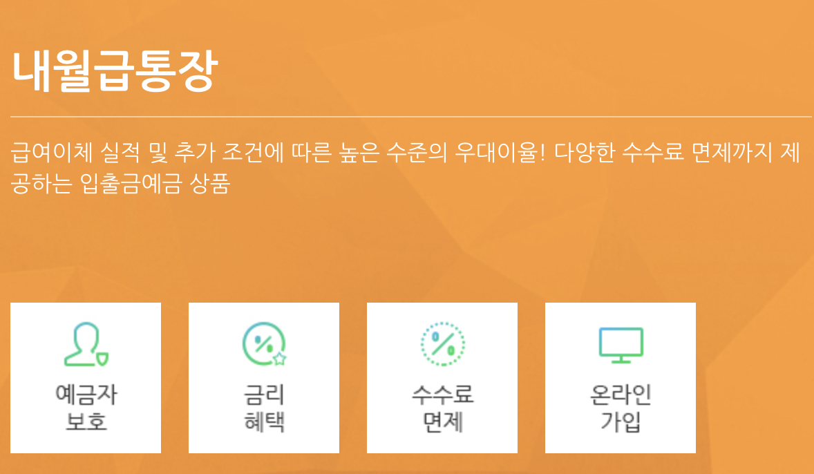 - 급여이체 : 급여를 이 통장으로 이체하면 금액에 따라 최대 1.0%까지 추가 이자를 받을 수 있다.