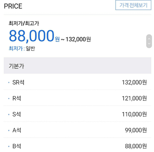 SR석의 가격 132,000원 / R석의 가격 121,100원/ S석의 가격 110,000원 / A석의 가격 99,000원/B석의 가격 88,000원으로 매우 다양한 가격을 형성하고 있고, 아마 부모님을 위한 예매가 주를 이루기 때문에 아마 많은 이들이 SR석을 노리지 않을까 생각된다.
