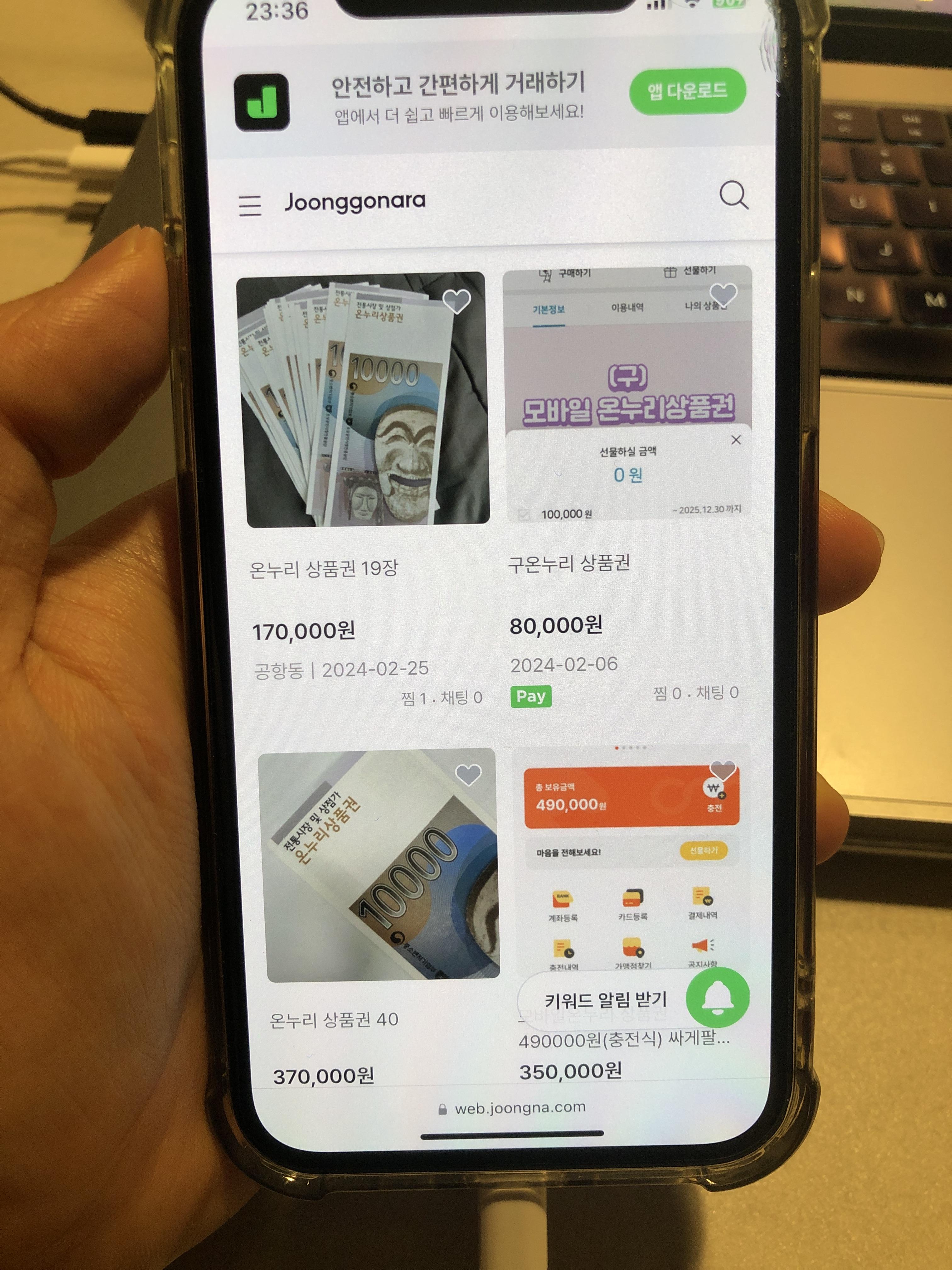 만약 아무리 생각해도 내가 온누리상품권을 쓸만한 곳이 없다고 생각하거나, 최대한 많은 금액을 현금화 하고 싶다면 위 사진처럼 중고거래 마켓을 이용하는 방법도 있다.