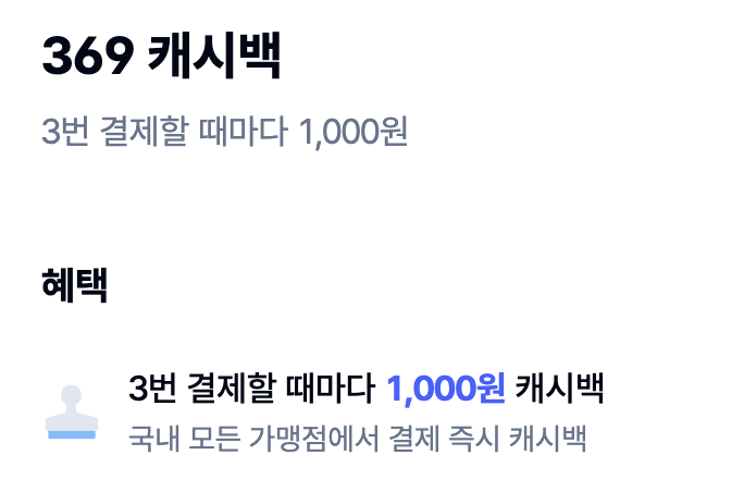 - 혜택 내용 : 5천 원 이상 결제할 때마다 스탬프 1개를 적립하고, 3번 결제할 때마다 1,000원씩 캐시백