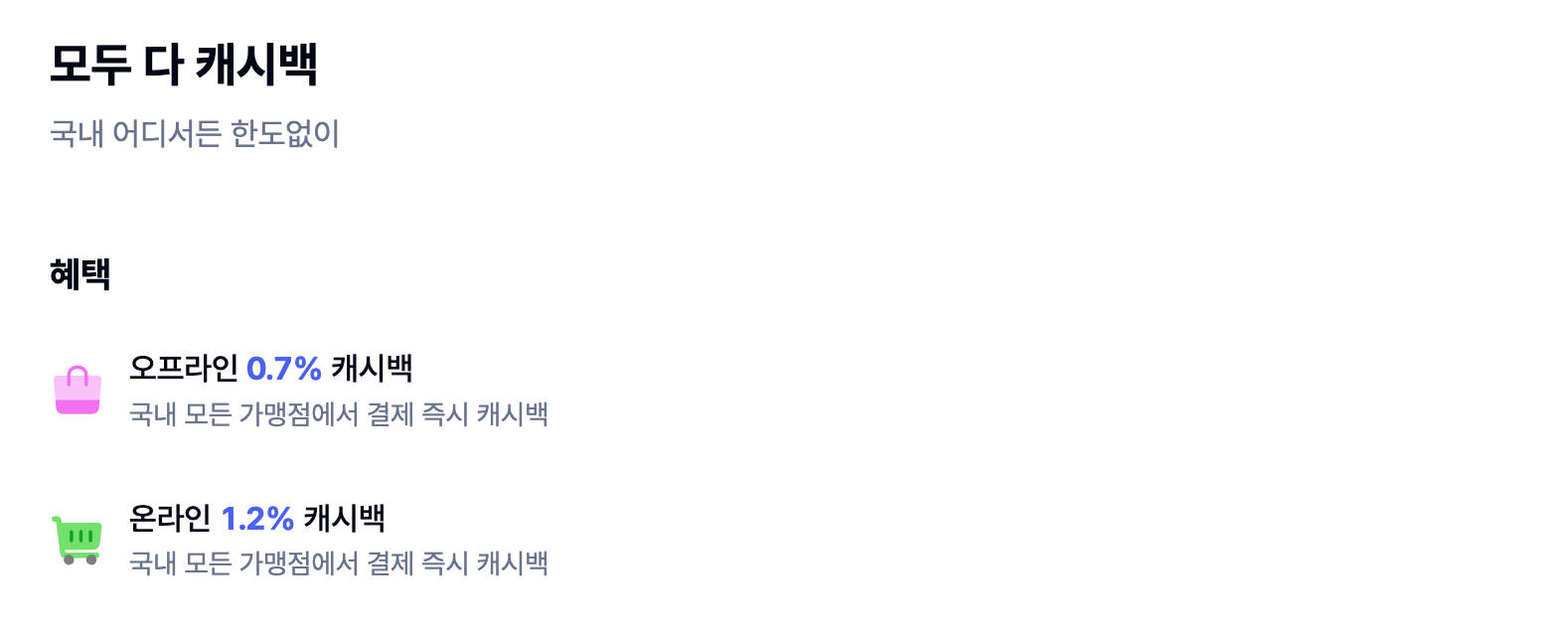 - 혜택 내용 : 오프라인 결제 시 0.7%, 온라인 결제 시 1.2% 모든 가맹점에서 캐시백 제공