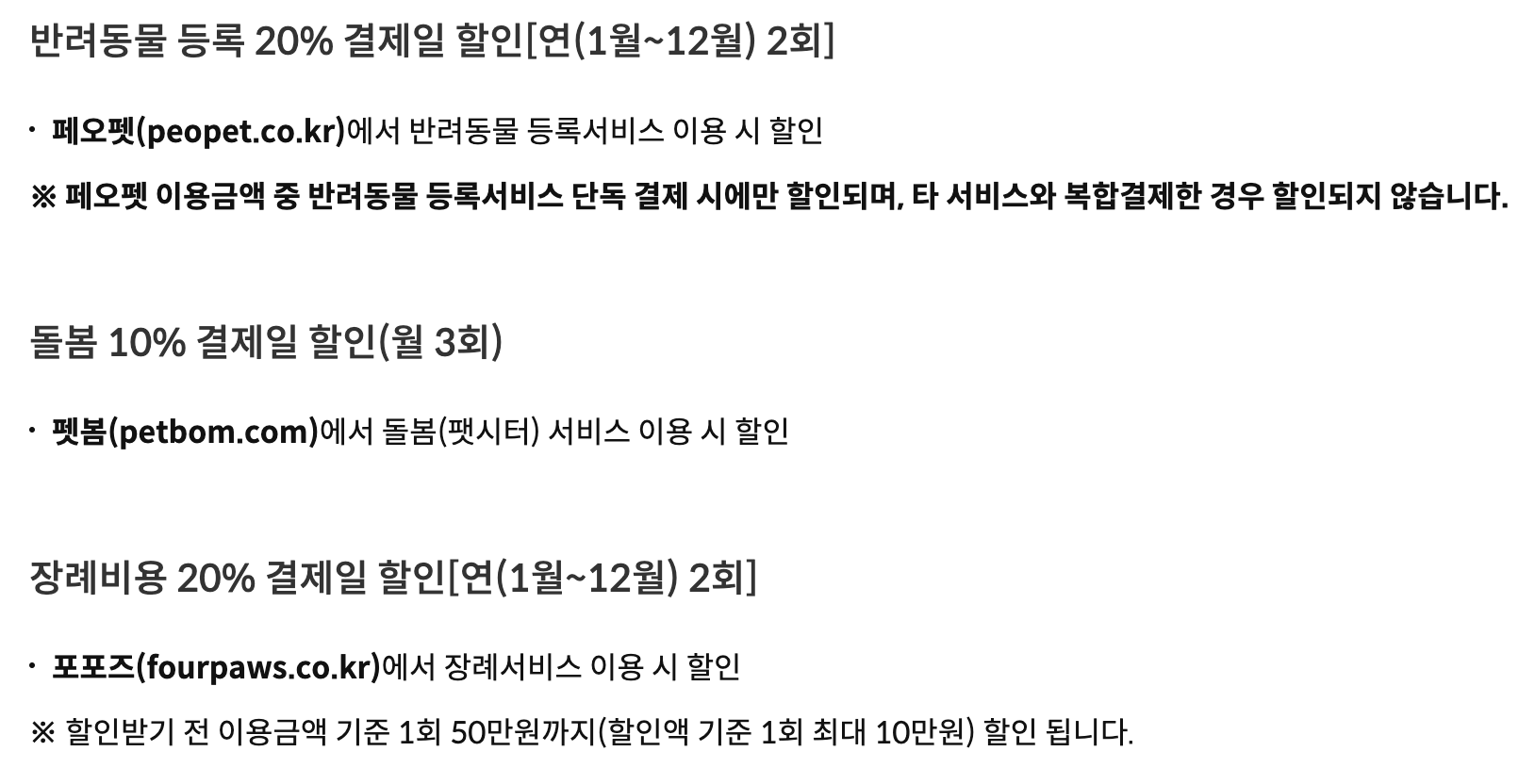 반려동물을 등록할 때 등록비용을 20% 할인해주거나, 돌봄서비스를 10% 할인해주거나, 장례비용을 20% 할인해주는 혜택 등 실질적으로 꼭 필요한 서비스에 대한 할인은 전월실적에 무관하게 받을 수 있다는 점이 큰 장점으로 보였다.