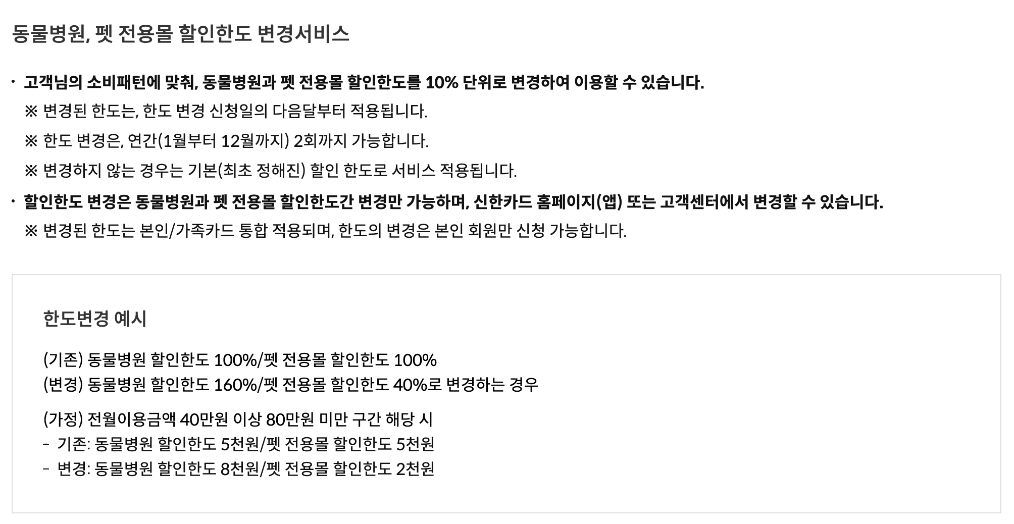 예를 들면, 기존에는 100% / 100%의 할인 비율로 월 최대 할인이 각각 2만 원씩이었다면, 150% / 50%로 줄여서 동물병원 월 할인 한도를 3만 원으로 늘리고 펫 전용 몰에서 월 할인한도를 10,000원으로 줄이는 방식으로 바꾸는 것이다.