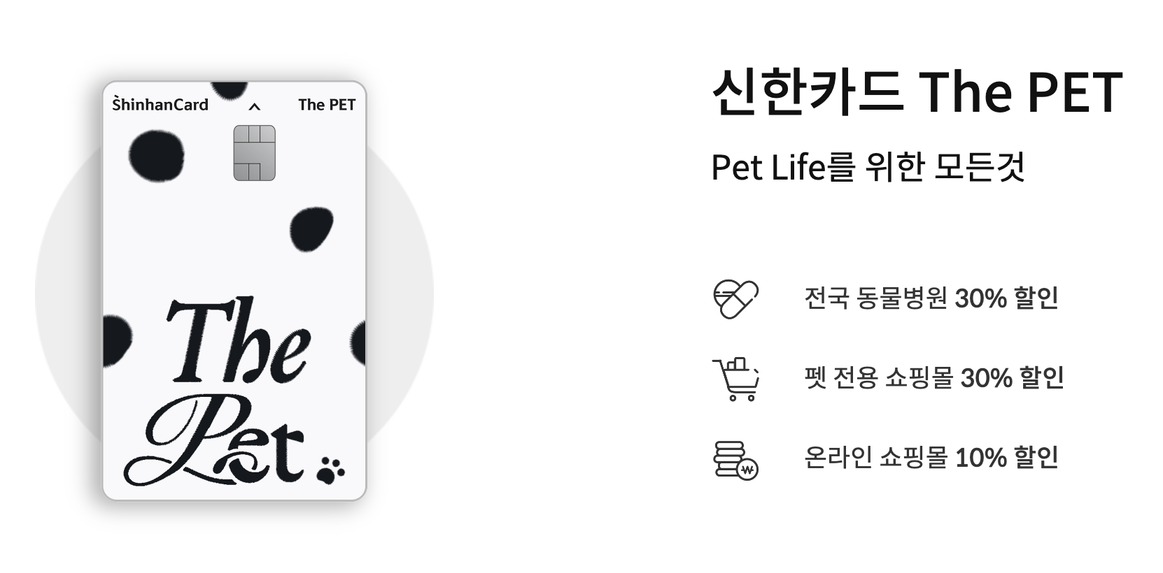 신한카드 The PET은 동물병원이나 펫 전용상품을 구매하는 쇼핑몰에서 한 달에 최대 4만 원의 혜택과 함께 다양한 펫 라이프 분야에서 실적에 무관하게 최대 10만 원까지 할인을 받을 수 있는 카드다.