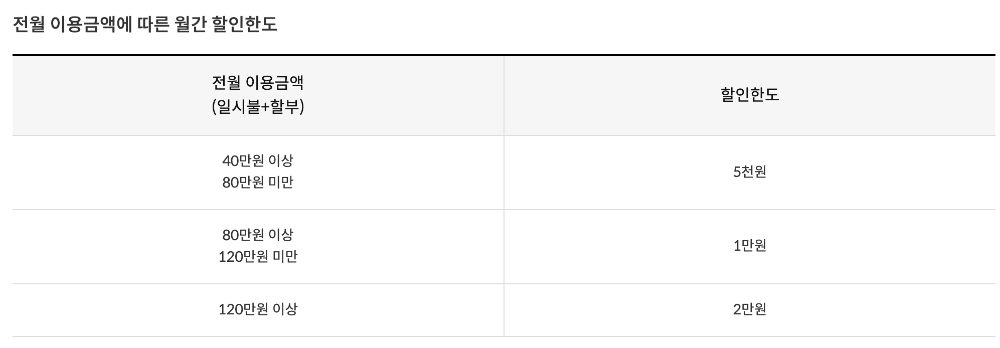 이는 1년에 2번까지 설정할 수 있으며, 내 소비패턴에 맞게 또는 목돈이 들어갈만한 곳에서 더 큰 폭으 할인을 받을 수 있도록 변경이 가능하다는 점이 독특한 점이라고 할 수 있겠다.