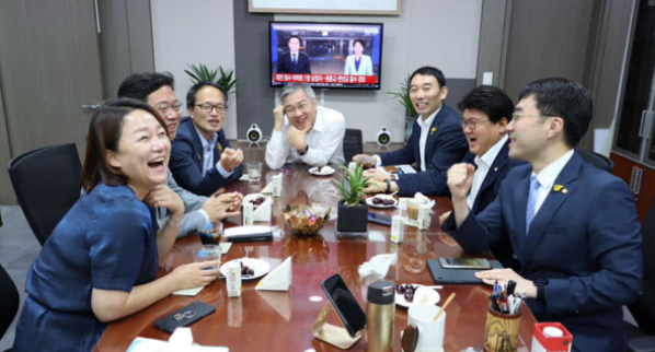 그 사진 안에는 최강욱 대표와 황운하 의원을 비롯해서 민주당 박줌ㄴ 최고위원과 이재정/김남국/김승원/김용민 의원이 최강욱 대표의 사무실로 추정되는 한 장소에 모여서 이야기를 나누는 모습과 카메라를 보며 웃고 엄지를 들어보인 사진도 그 중에는 보였다.