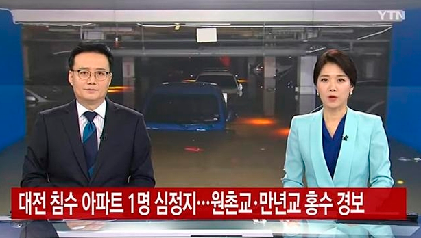 당시에 보도 화면에서 보여준 것은 물이 잔뜩 올라온 도로 영상과 함께 "대전 침수 아파트 1명 심정지...원촌교,만년교 홍수 경보"라는 자막이 함께 나오고 있었던 시점이었다.