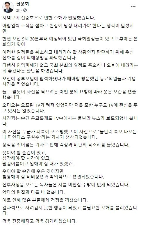 주된 내용은 지역구에 집중호우로 인한 수해가 발생했고, 소식을 접한 후 현장에 전화를 걸어서 피해상황 파악 후 국회 본회의 일정을 마치고 오후에 내려가기로 한 상황이었고, 오전에 공부모임에 참석했다가 때마침 방문했던 동료의원들과 기념사진을 찍었다는 내용이었다.