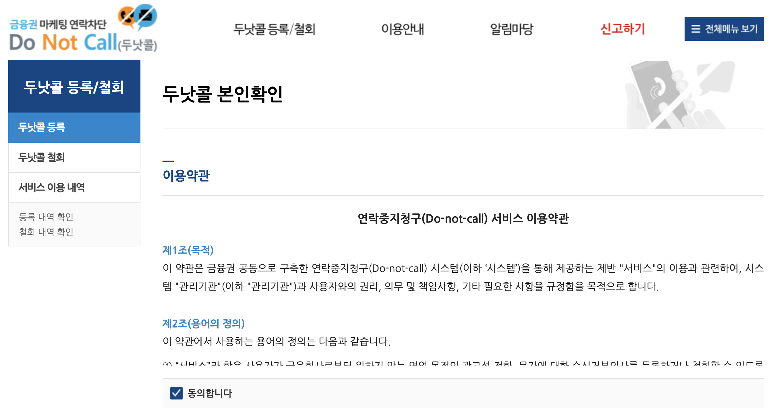 두낫콜은 스팸 전화 및 문자 스미싱 차단을 위한 가장 좋은 방법이다. 두 곳의 사이트가 있으며, 이름이 같더라도 둘 다 신청하는 것이 획기적으로 스팸 전화나 문자를 줄일 수 있다.