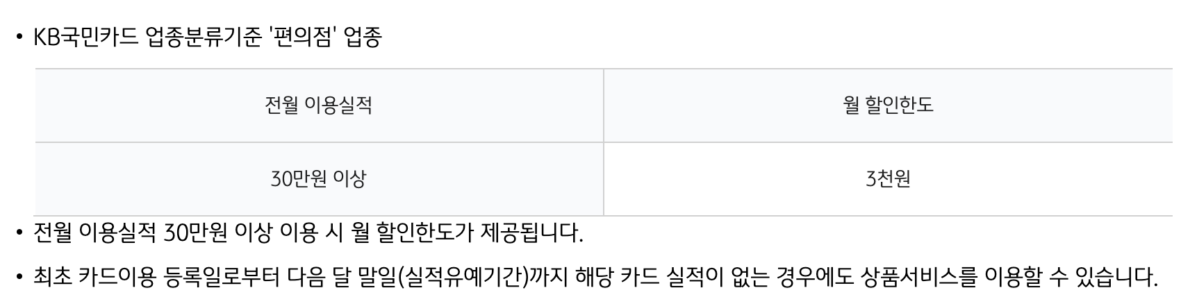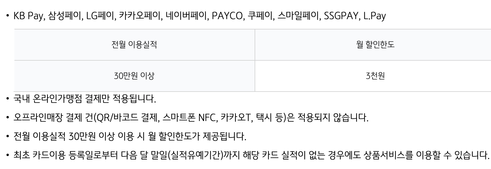 위에서 소개한 KB국민카드 톡톡O의 100% 청구할인 혜택을 제공받기 위해서는 몇 가지 조건을 충족해야 한다. 우선 전월 카드 사용 실적이 30만 원 이상이어야 하는데, 이는 대부분 사람들이 생활 속에서 쉽게 달성할 수 있는 금액이다.