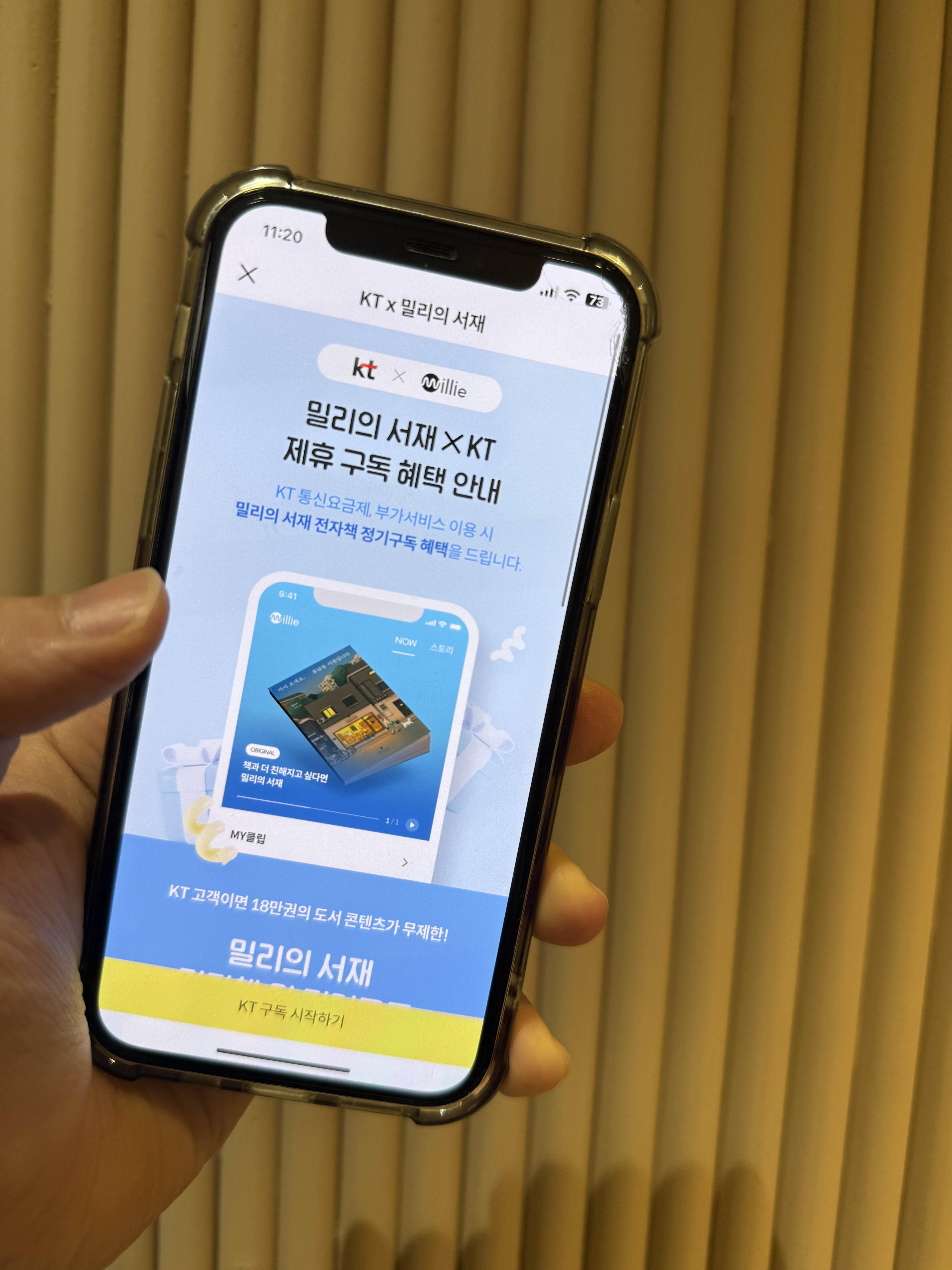 그러다가 밀리의 서재를 통해서 책을 읽고 마음을 다스리는데 도움을 받고자 다시 설치하고 로그인을 했더니, 팝업으로 KT와 제휴를 통한 '구독 대상자'라는 문구를 확인했다.