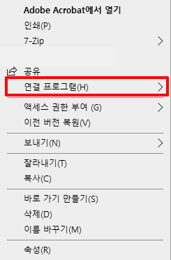 그리고 PDF 파일 형식을 선택한 뒤 어도피 아크로뱃 리더를 선택하거나, PDF 파일에 마우스를 올리고 우클릭 후 [연결 프로그램] 항목에서 [Adobe Acrobat Reader]를 선택하면 된다.(사진에서는 Adobe Acrobat DC로 표기)