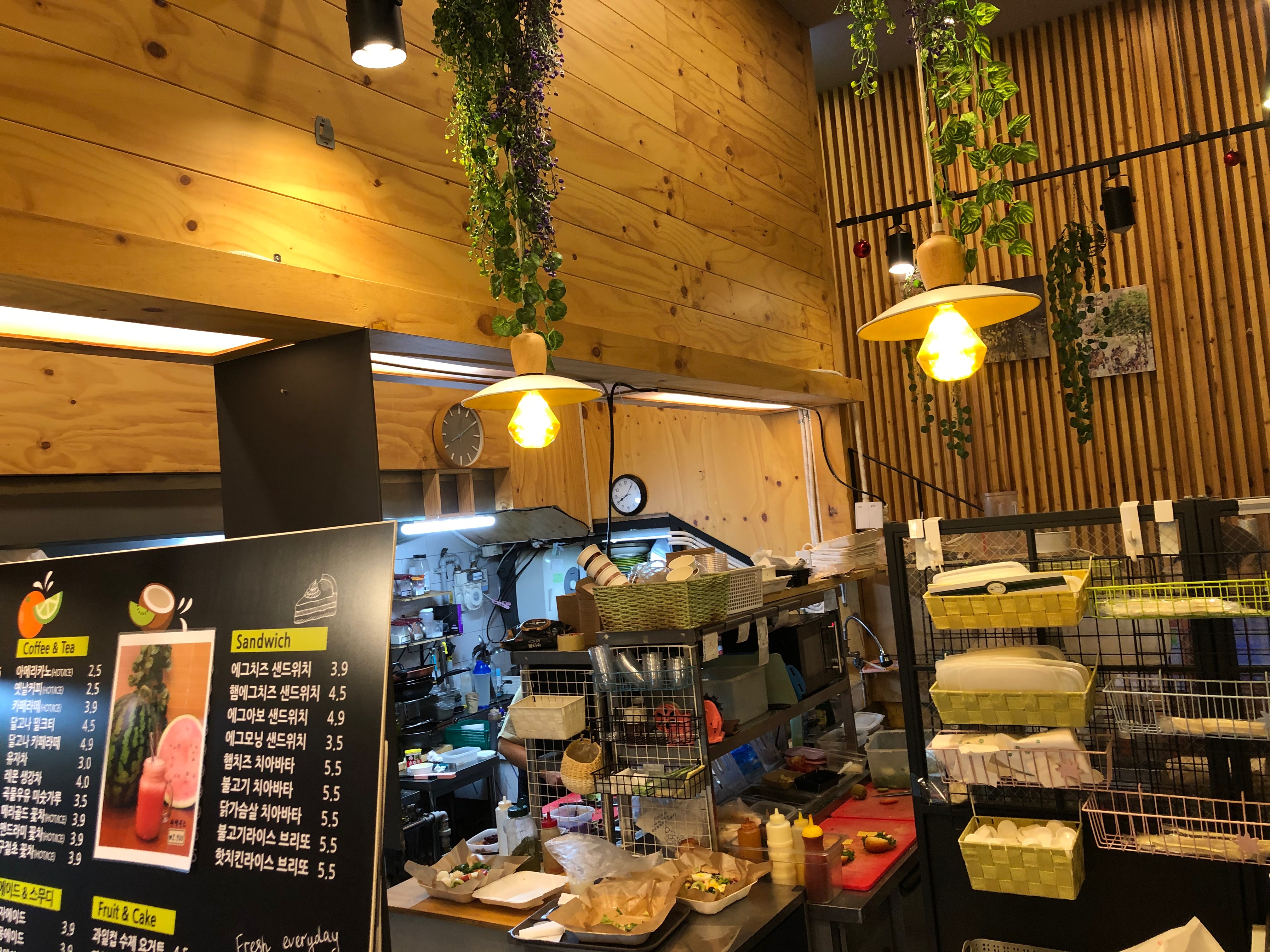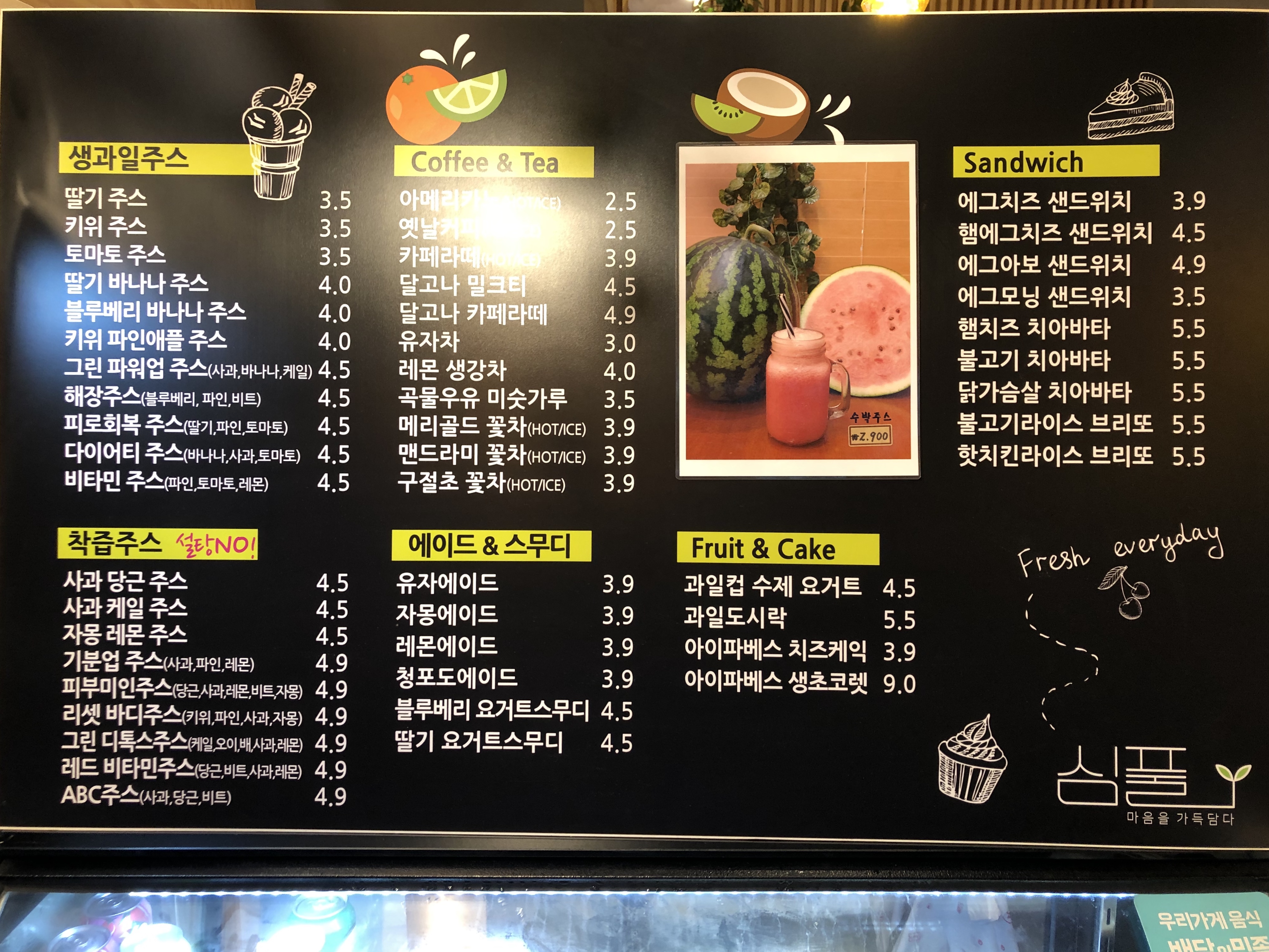 일단 신선한 과일들을 이용한 생과일 주스나 착즙주스들이 있고 바쁜 직장인들이 출근길에 손에 들고가며 먹을 수 있는 샌드위치나 케이크 그리고 수제요거트도 판매중이다.