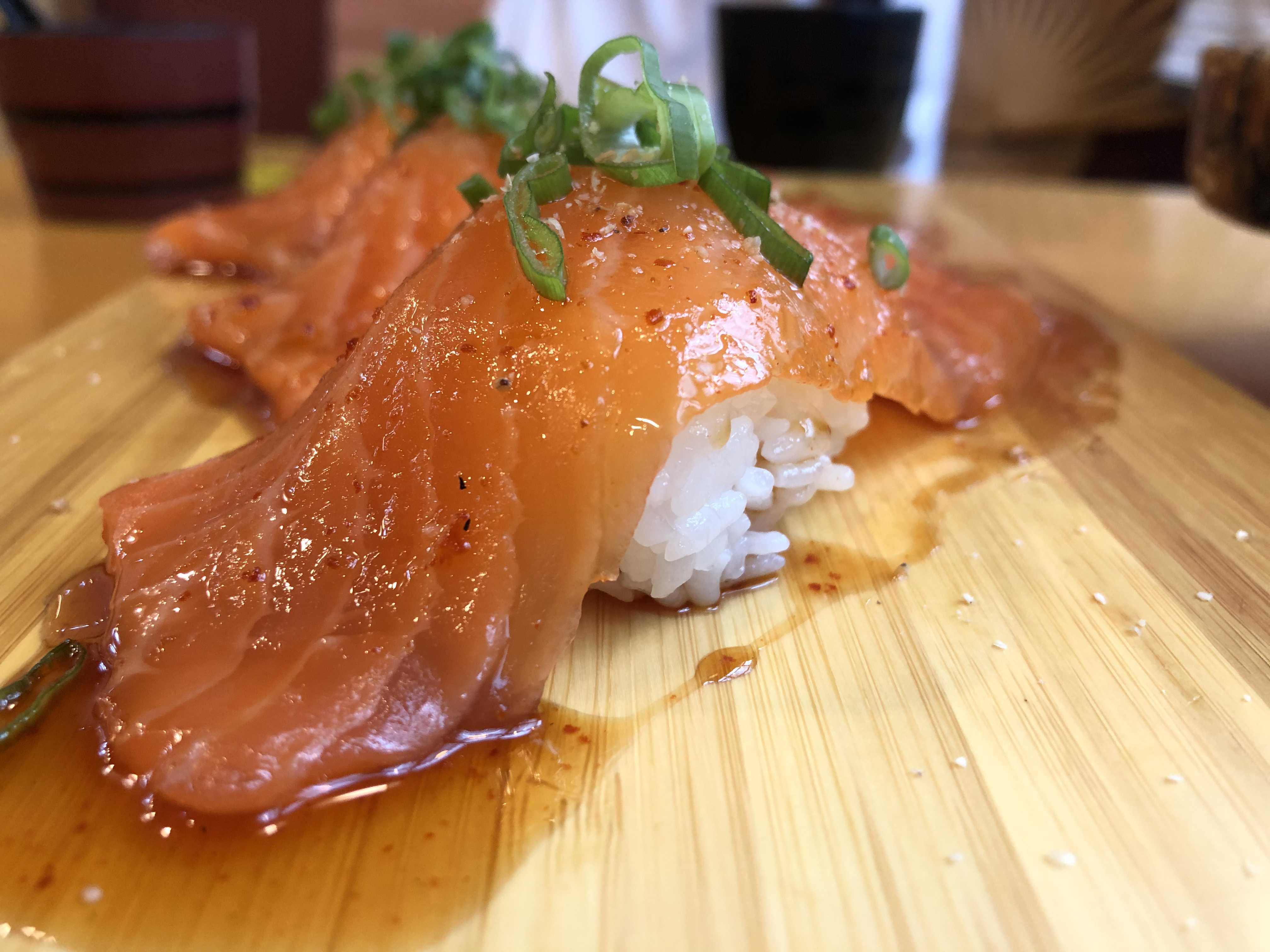 연어의 질긴부분은 모두 제거하고 부드러운 부분으로만 초밥이 구성되어있으며 간장소스도 입에 쫙 달라붙는 맛이다.
