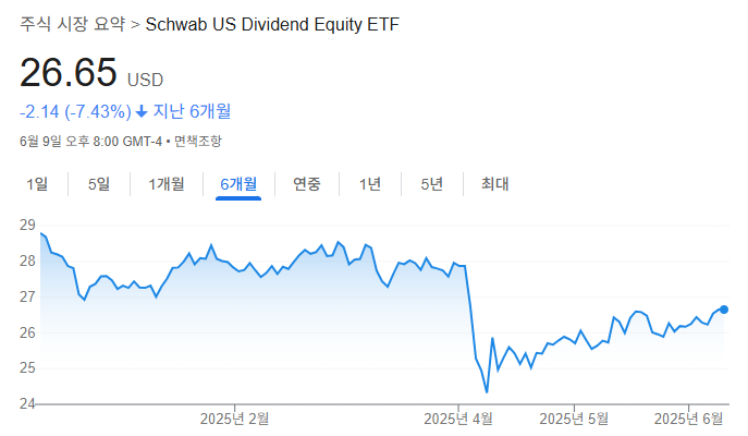 예를 들어 SCHD의 현재 배당수익률이 4.4%라면 주가가 10% 하락할 경우 배당수익률은 약 4.9%로 상승하게 되요.