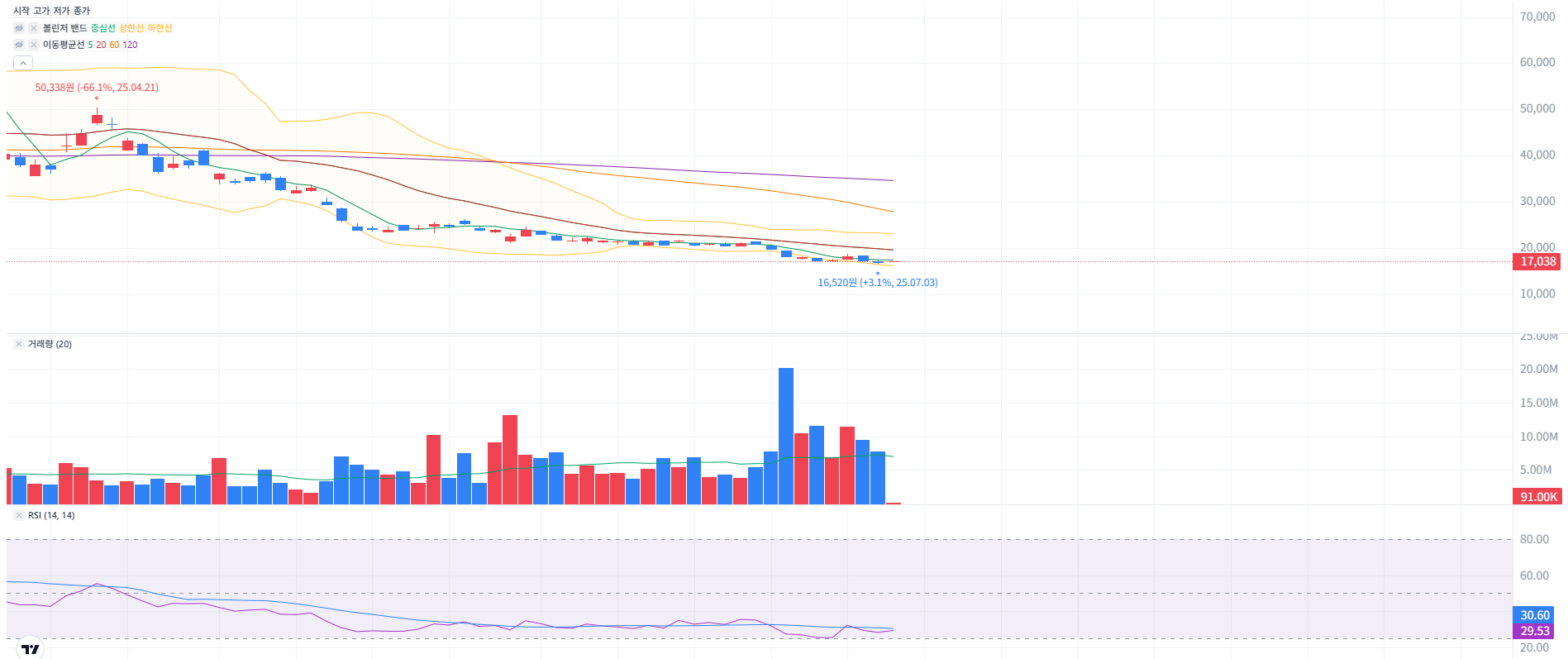 - 동시에 RSI가 30 이하, 특히 25 이하로 떨어지는 경우(강한 과매도)