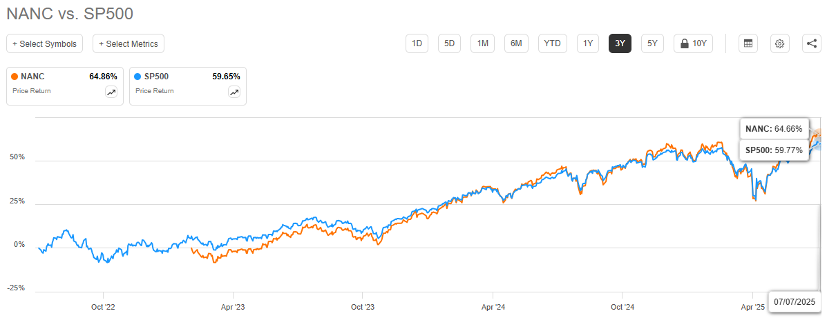 그럼 NANC ETF가 시장 평균과 비교했을 때 어떤지가 궁금하실텐데요. S&P 500 ETF는 미국의 큰 기업 500개를 모아놓은 ETF로 시장의 기준점이라고 할 수 있는데요. 2025년 7월 기준으로 두 ETF의 수익률을 비교해볼게요.