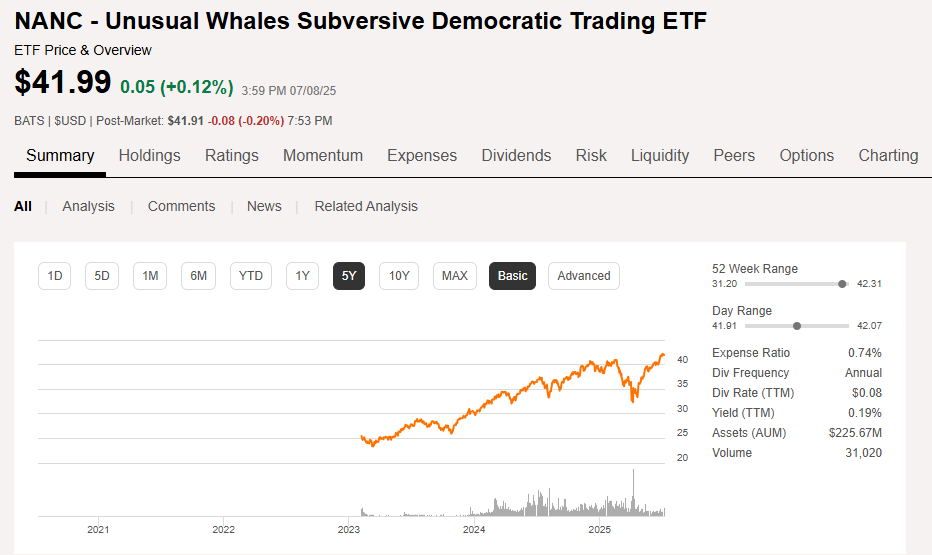 NANC ETF는 Unusual Whales Subversive Democratic Trading ETF라는 정식 명칭을 가진 ETF에요. 미국 민주당 의원들이 투자한 주식들을 따라가는 상품인데요.