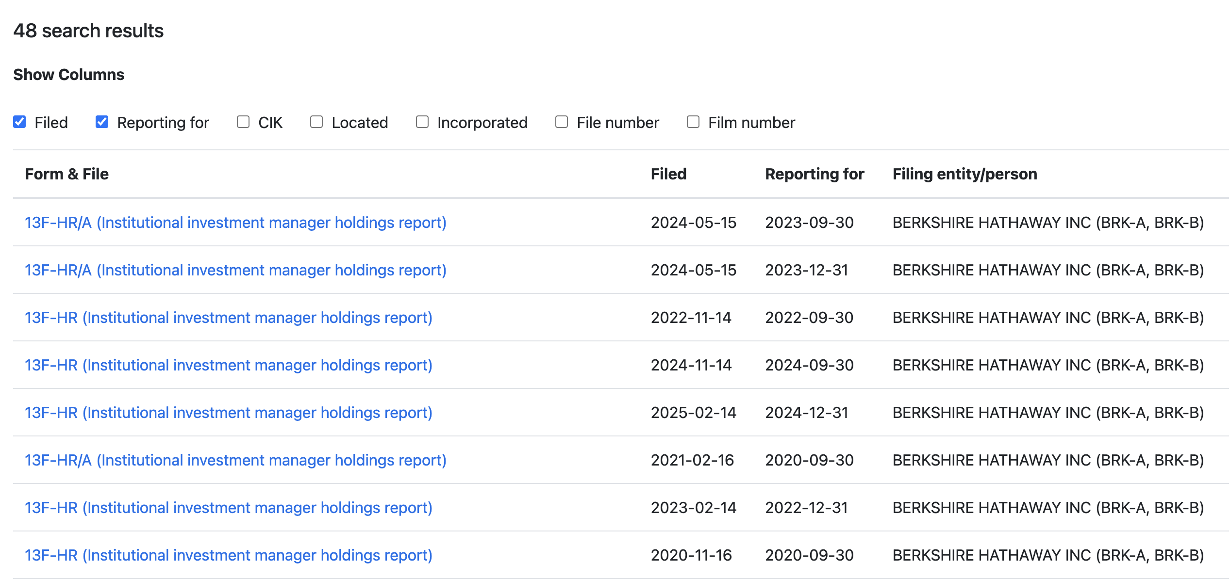 • Form 13F-HR을 선택하면 포트폴리오 내역을 확인할 수 있음(위 사진처럼)