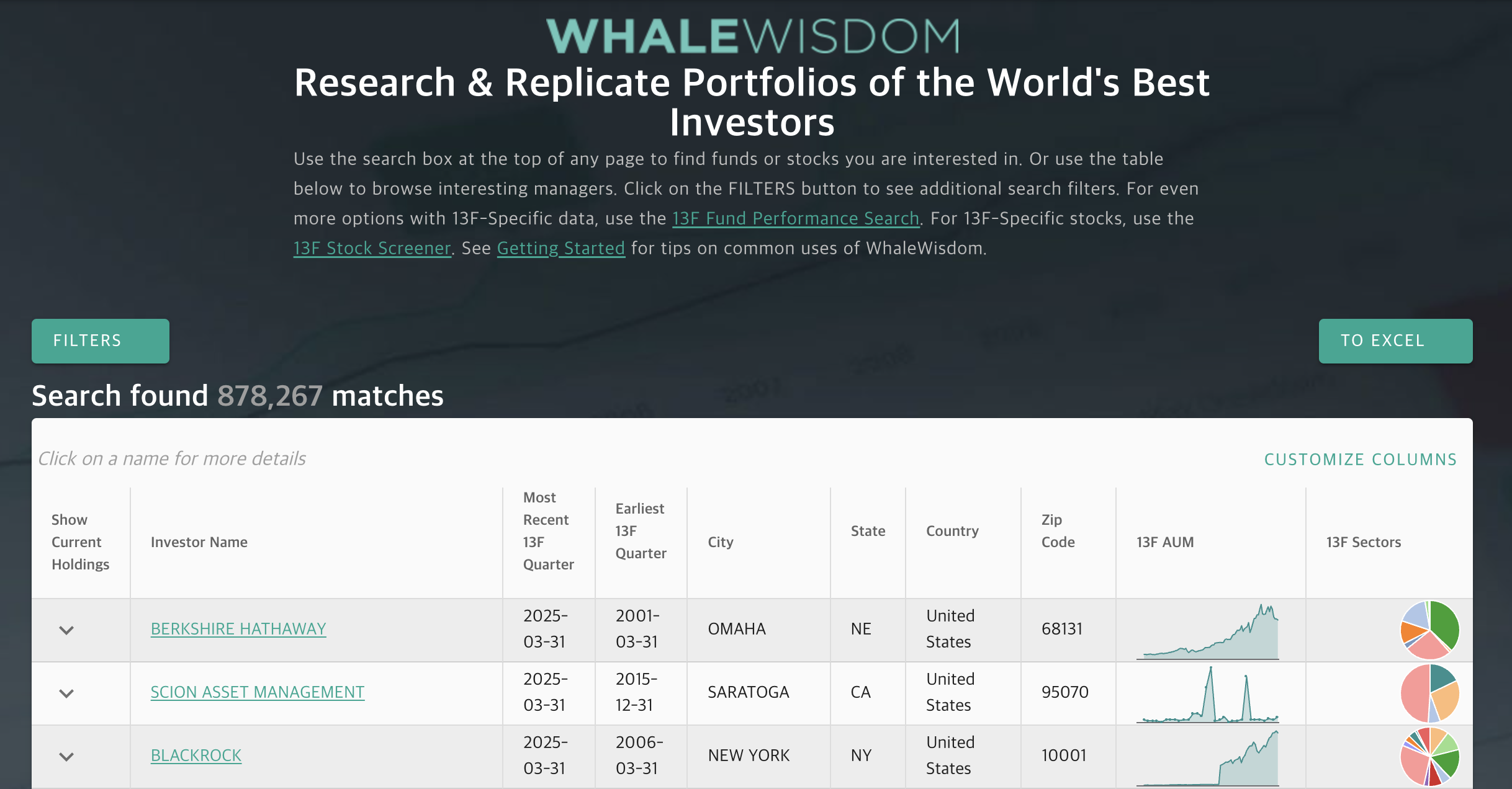 초보자에게 가장 추천하는 방법 중 하나는 바로 WhaleWisdom인데요. 이 사이트는 13F 사이트의 데이터들을 예쁘게 시각화해서 누구나 쉽게 확인할 수 있도록 도와줘요.