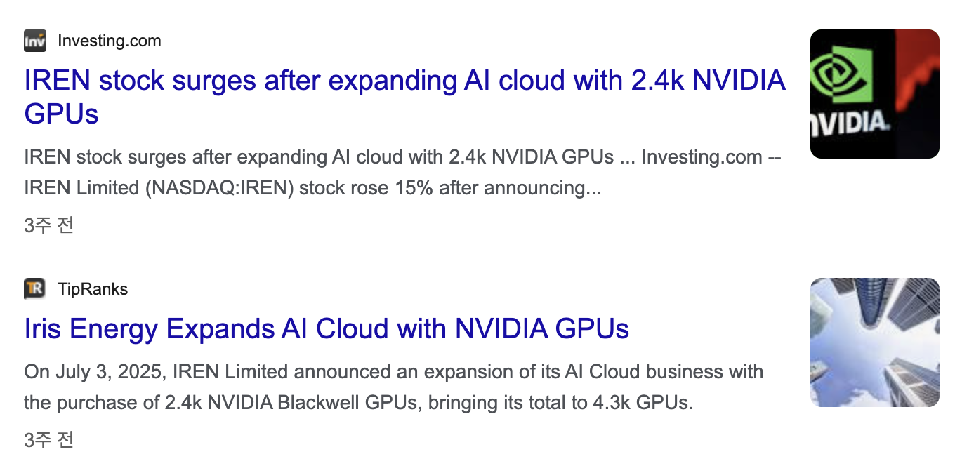 2025년 7월에 아이렌은 엔비디아의 블렉웰 B200 및 B300 GPU를 무려 2,400대나 1.3억 달러를 주고 구입했으며, 2025년 4분기에는 50MW급 수랭식 AI 데이터센터인 '호라이즌1'을 가동할 예정이거든요.