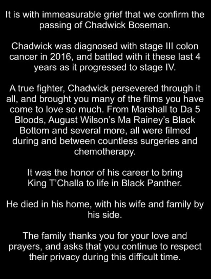 "채드윅 보스만의 사망을 알리게 된 것은 큰 슬픔이다. 채드윅 보스만은 2016년 대장암 3기 진단을 받았고, 이어 4기로 진행되며 지난 4년 동안 대장암과 싸워왔다."라며 그의 사망이유를 '대장암'으로 밝혔다.