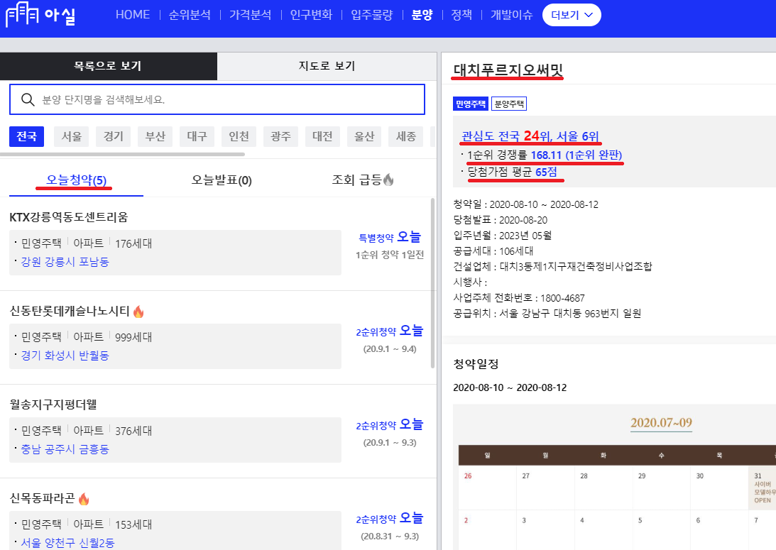 또한 청약공고만 확인 가능한 것이 아니라 사람들의 관심도와 1순위 경쟁률 그리고 당첨가점의 평균점수까지 확인이 가능하다는 점은 아실만의 장점이 아닐까 생각한다.