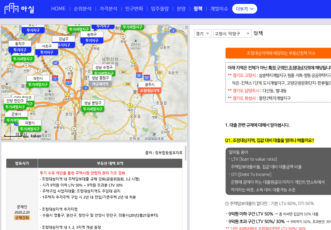 시시각각으로 상황이 변하며 정부의 말 한마디에도 시세가 흔들릴 수 있기 때문이다. 정책까지도 아실을 통하면 한번에 확인이 가능하다는 사실.
