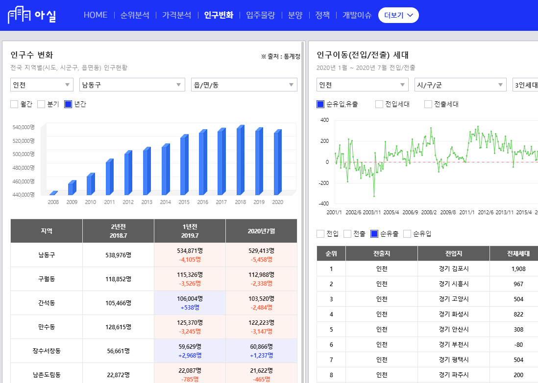 그럼 내가 새로운 지역으로 이사를 갈 때, 그 지역이 앞으로 발전할지 아닐지를 판단하는 좋은 지표로 활용이 가능한데, 아실에서는 인구변화까지도 확인이 가능하다.