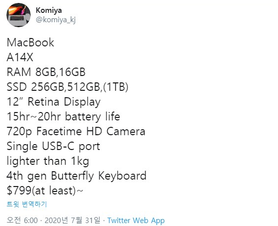 현재 12인치 ARM 맥북의 스펙이 유출되었는데, 트위터에 유출된 것이기 때문에 출시되면 사실과는 다를 수 있지만 참고 정도는 할 수 있을 것으로 생각된다.