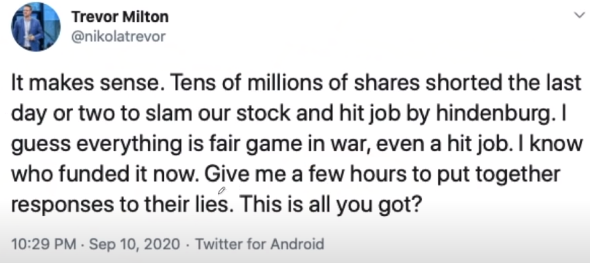 바로 '힌덴버그 리서치'라는 금융 분석 업체에서 "니콜라는 창업자이면서 최고경영자 트레버 밀턴의 수십가지 거짓말을 기반으로 세워진 사기 사례"라는 내용의 보고서를 내면서 불이 붙었다.