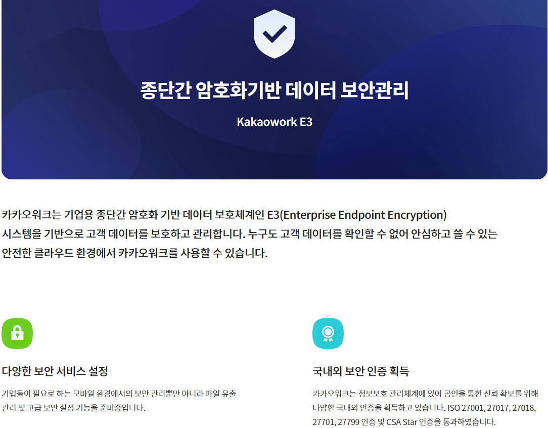 기업용 종단 간 암호화 기반 메시징이 포함된 종합 보안시스템으로 보통의 메신저들은 스마트폰에 많은 데이터를 남기는데 반해, 카카오워크는 서버/클라우드 기반이며 메시지의 개별 암호화를 시행하지만 성능면에서는 손해보지 않았다는 점을 강조했다.