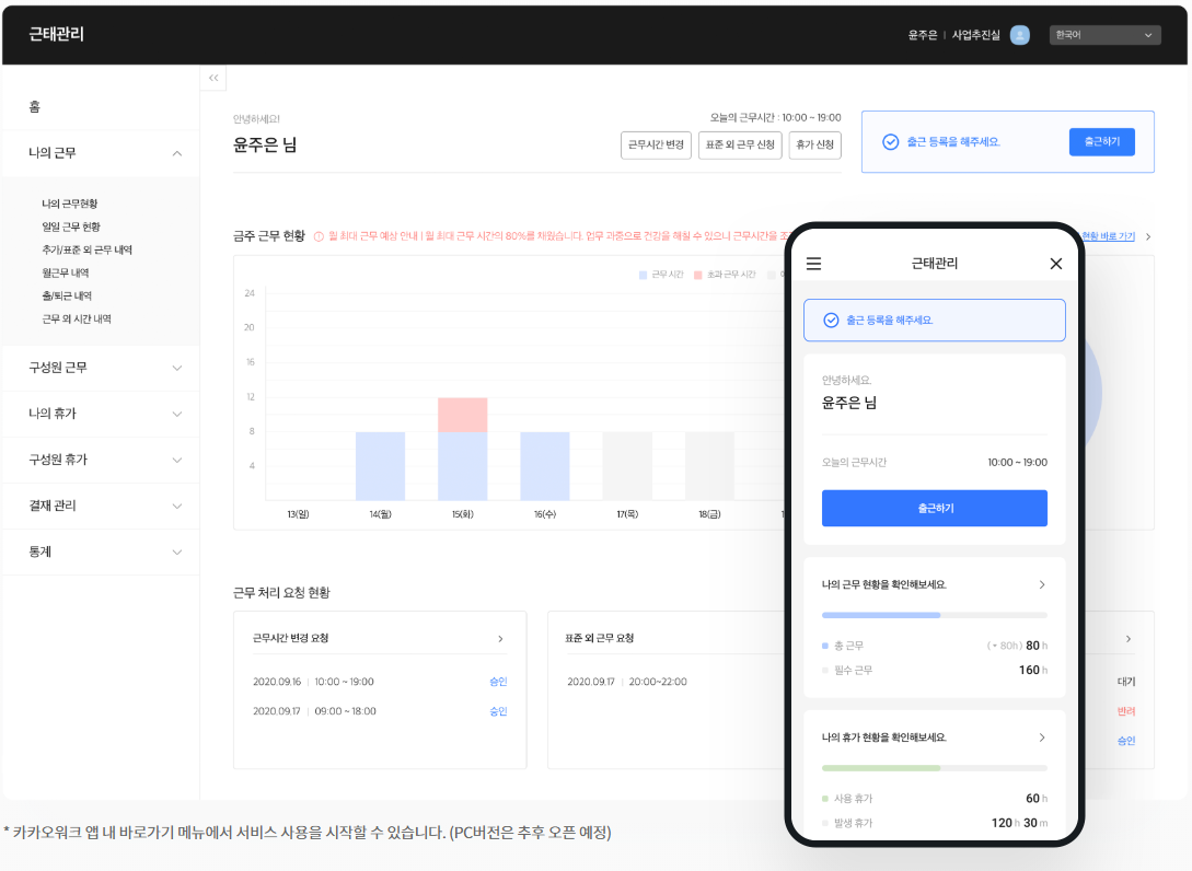 카카오로 근태를 관리할 수 있다니, 게다가 전자결재 서비스도 카카오워크를 통해서 시행하는 것으로 이제는 회사에서 별도의 프로그램 없이도 근태와 전자결재까지 한번에 해결이 가능하다는 점.