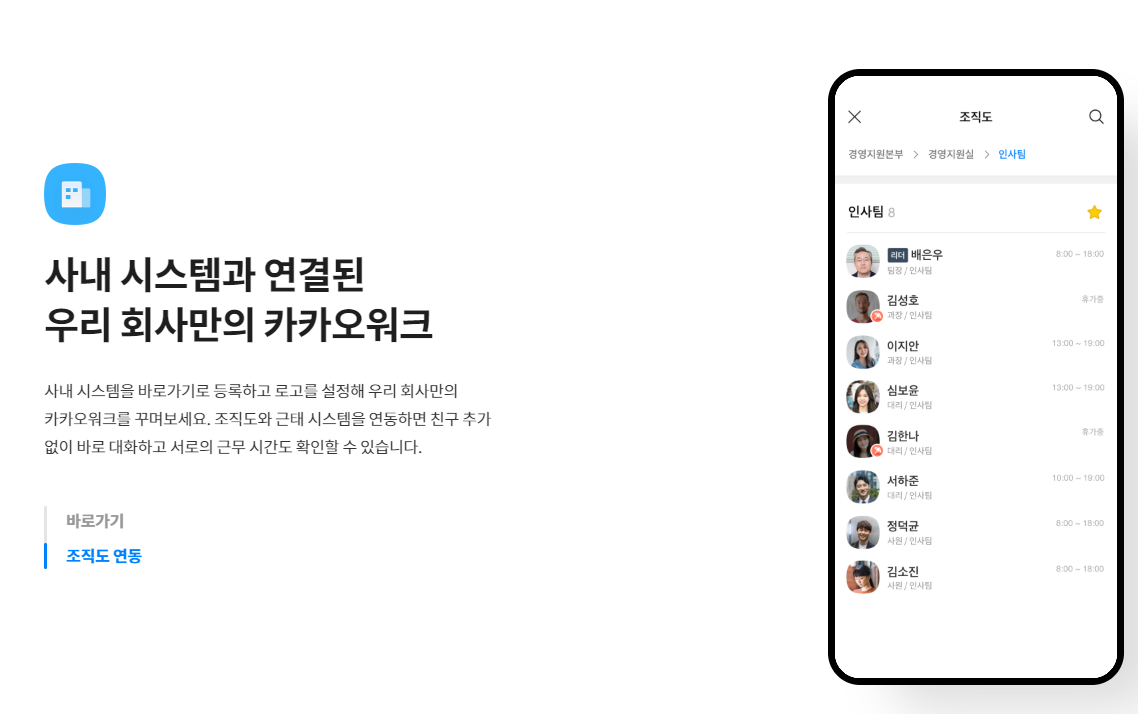회사 로고를 삽입 후에 조직도를 연결하게되면 개별적인 작업이 없어도 업무 담당자의 프로필과 근무시간, 연락처 등과 같은 업무에 필요한 정보들을 한 눈에 확인 가능하다는 점이 독특하다.