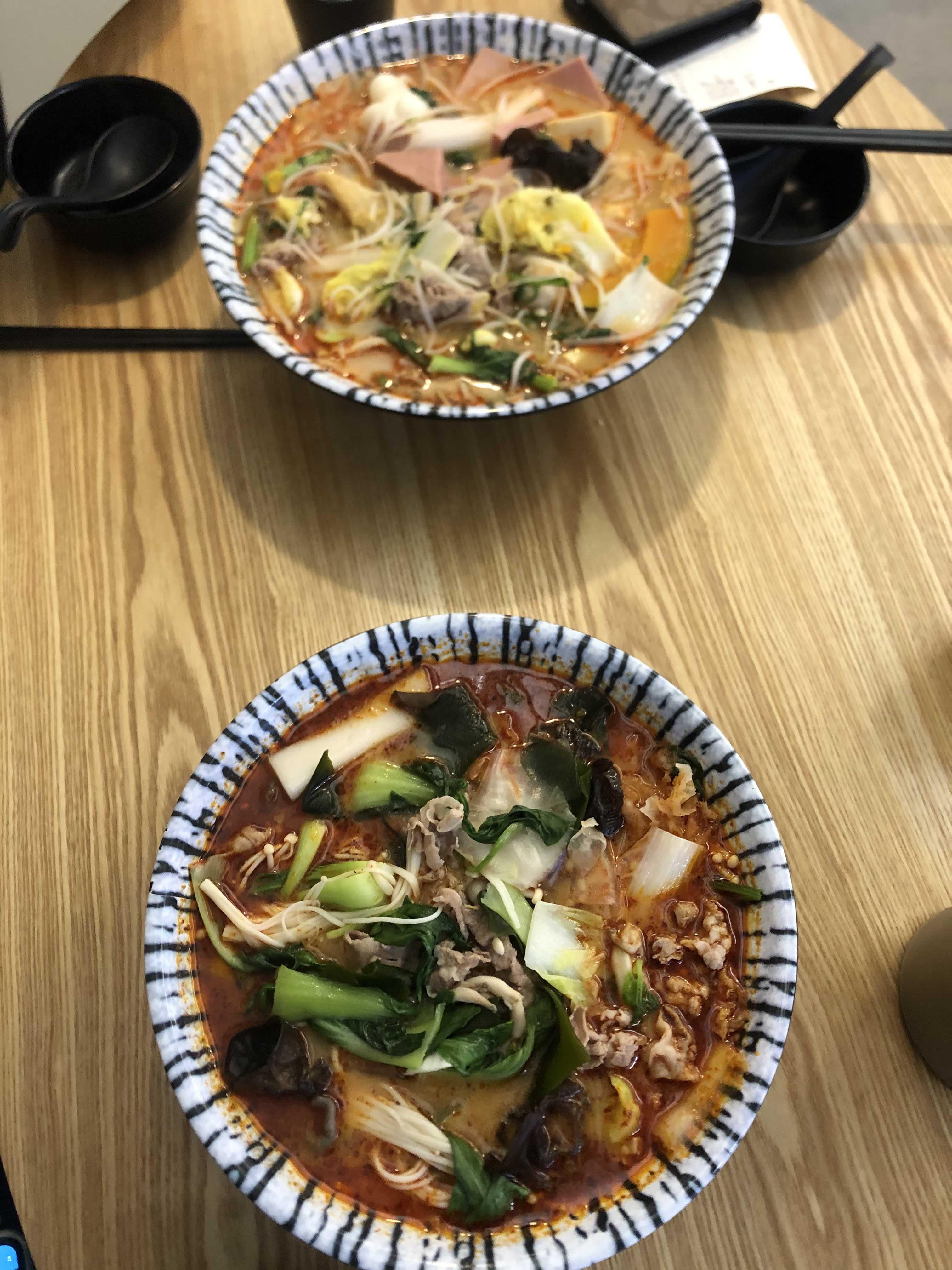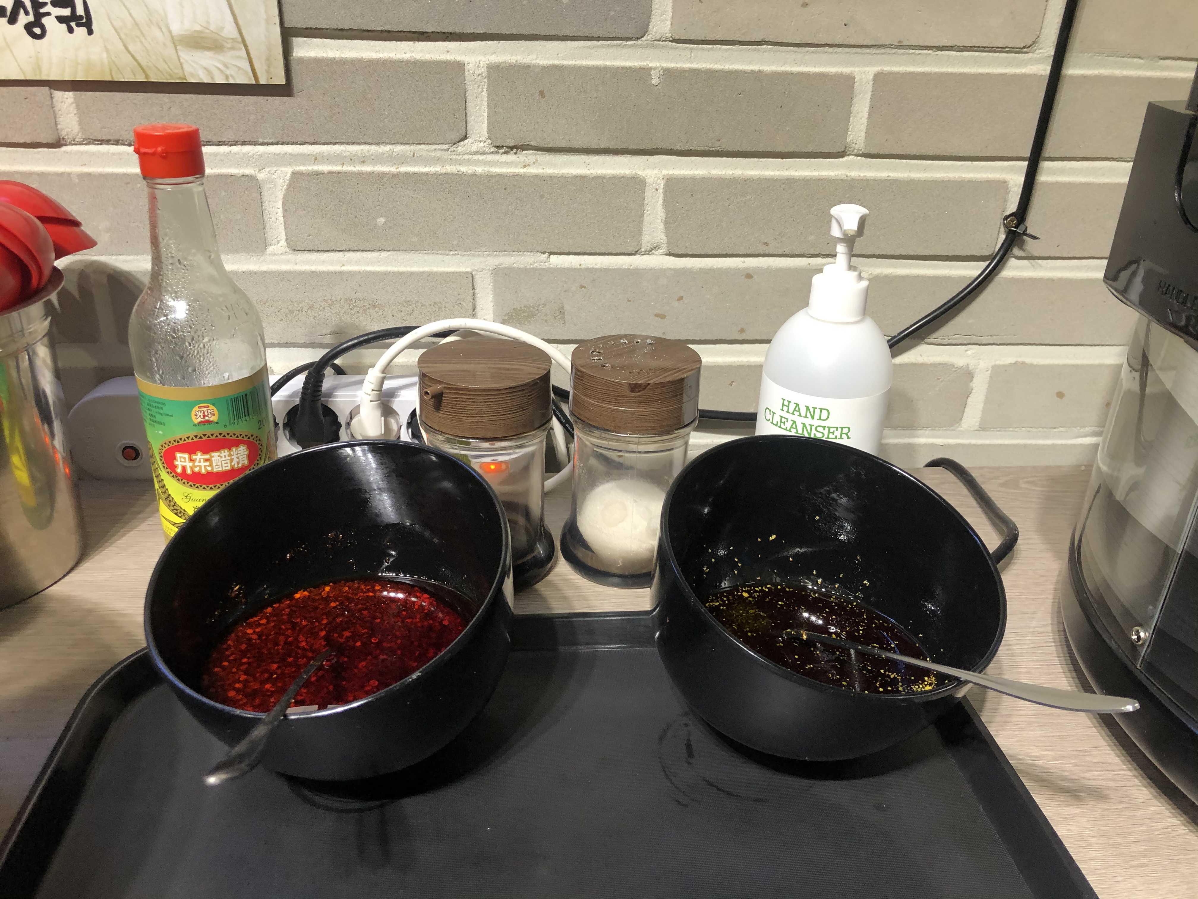 우리는 가장 매운 맛 마라탕과 보통맛 마라탕 두 종류를 주문했다.