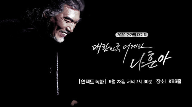 9월 30일에 방송되는 KBS2 '2020 한귕 대기획<대한민국 어게인 나훈아>는 '대한민국 트롯 황제'나훈아의 15년만의 방송 출연으로 코로나 19 사태의 장기화로 인해 지친 국민들을 위로하고 다시 한번 힘을 내자라는 취지로 마련된 공연이자 방송이라고 한다.