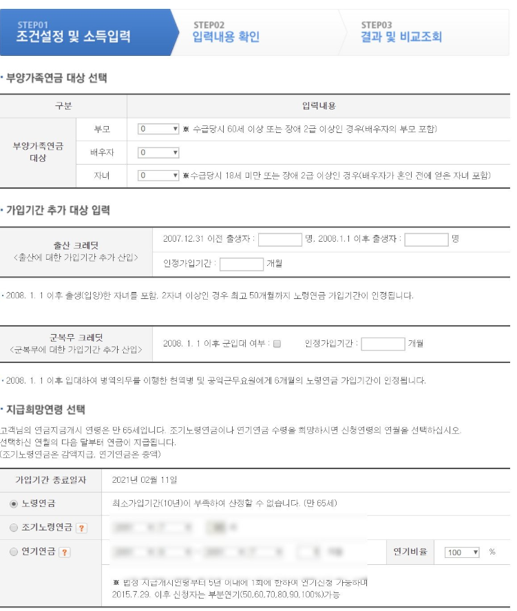 가입기간이 10년이 넘지 않은 경우에는 앞으로 납부해야 할 예상금액을 미리 알아볼 수 있으며, 가입 기간이 10년 이상 되면 그동안 납부한 내역만으로 예상 연금액에 대한 조회도 가능하다.